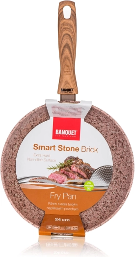 Univerzální pánev 24 cm s povrchem SMART STONE Brick pro každodenní vaření. Nabízí dvouvrstvý nepřilnavý povrch, rychlý a rovnoměrný rozvod tepla díky kovanému hliníku a indukční dno pro všechny typy sporáků. Ergonomická bakelitová rukojeť se soft touch úpravou v dekoru dřeva zajistí bezpečný a pohodlný úchop, snadnou údržbu doplňuje možnost mytí v myčce.