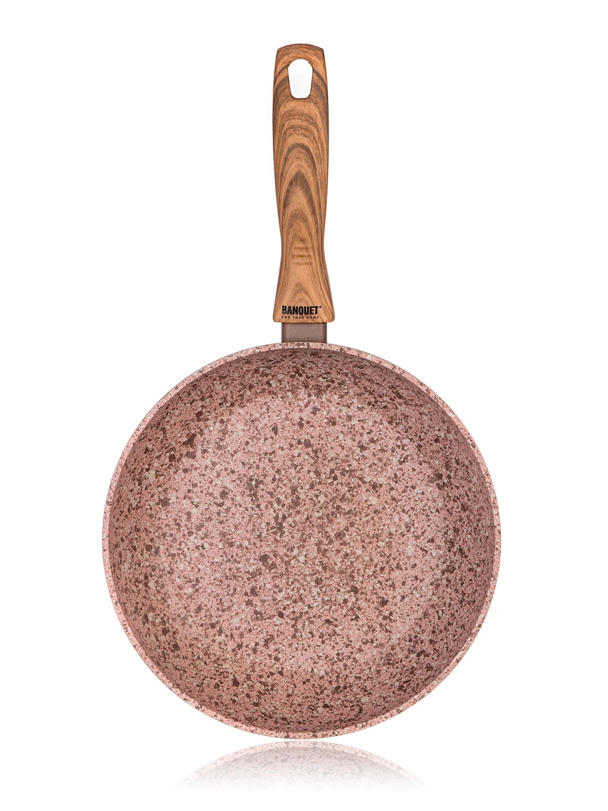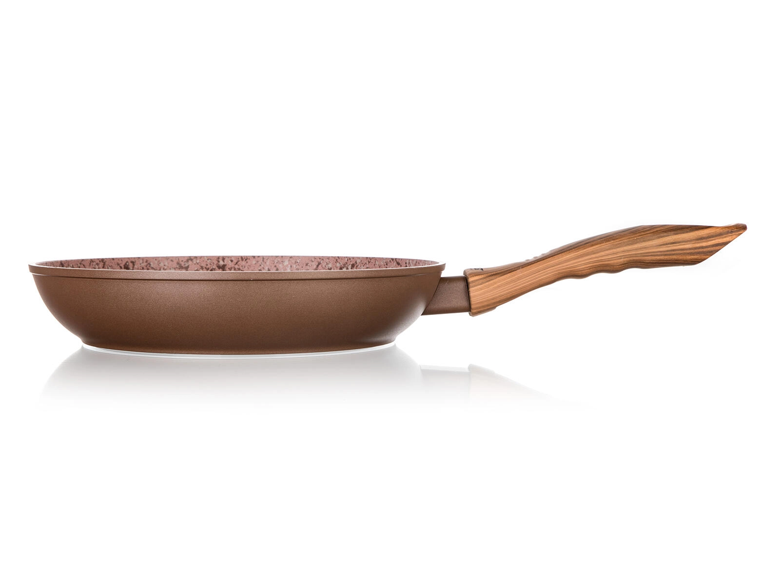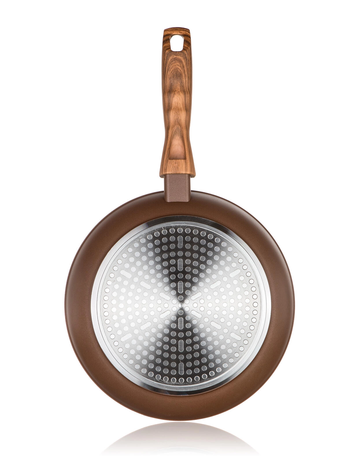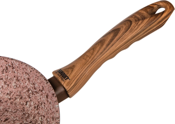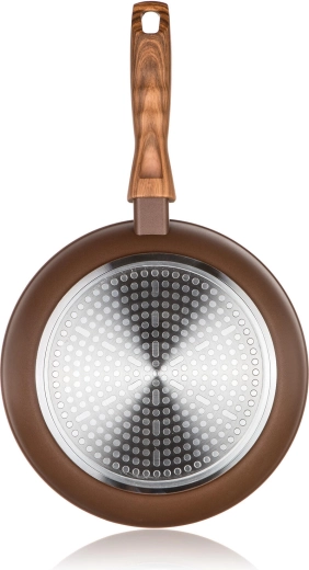 Díky celoplošnému indukčnímu dnu je pánev kompatibilní s elektrikou, plynem, sklokeramikou i indukcí. Ergonomická bakelitová rukojeť se soft touch povrchem v imitaci dřeva dobře padne do ruky a zůstává příjemně chladná.