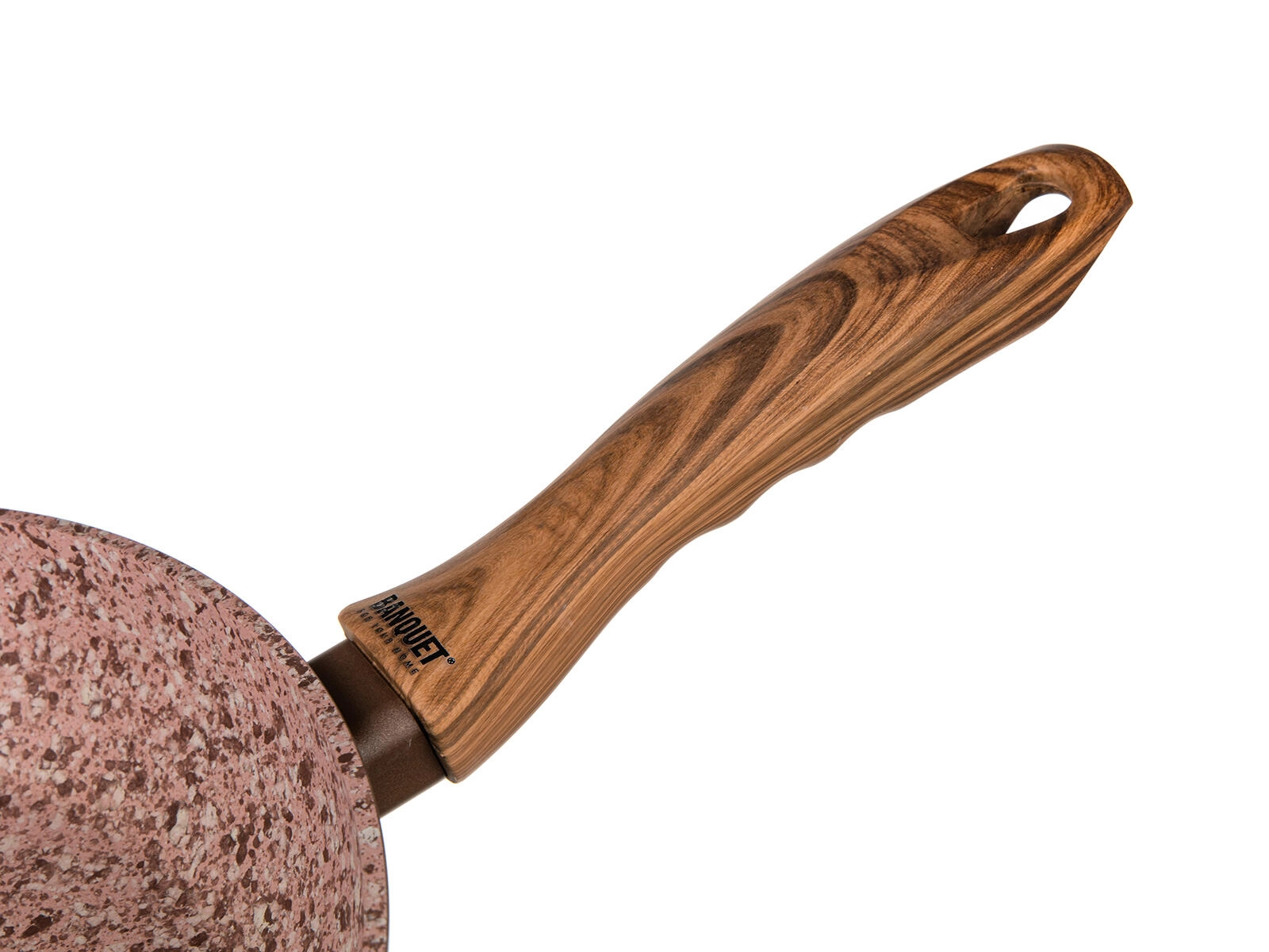 Bakelitová rukojeť v imitaci dřeva s protiskluzovým povrchem je příjemná do ruky a zůstává chladná.