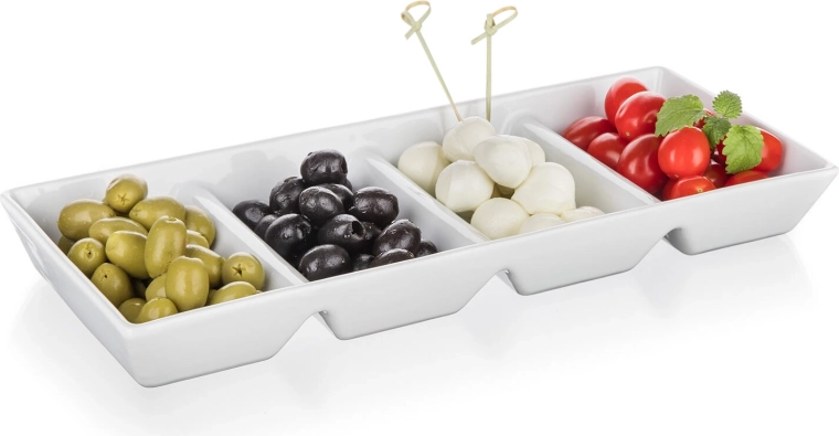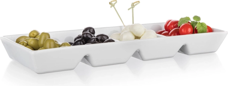 Čtyři oddíly udrží pochutiny přehledně oddělené – ideální pro olivy, mozzarellu, rajčata, oříšky či dipy. Žádné míchání chutí, čistá prezentace.