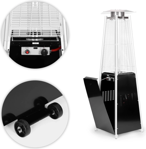 Ovládací panel umožňuje plynulé nastavení výkonu dle počasí. Elektrické zapalování (1× AAA, není součástí) usnadňuje start a energeticky úsporný provoz šetří plyn. Integrovaná přepravní kolečka a gumové koncovky nohou zjednoduší manipulaci a chrání podlahu.
