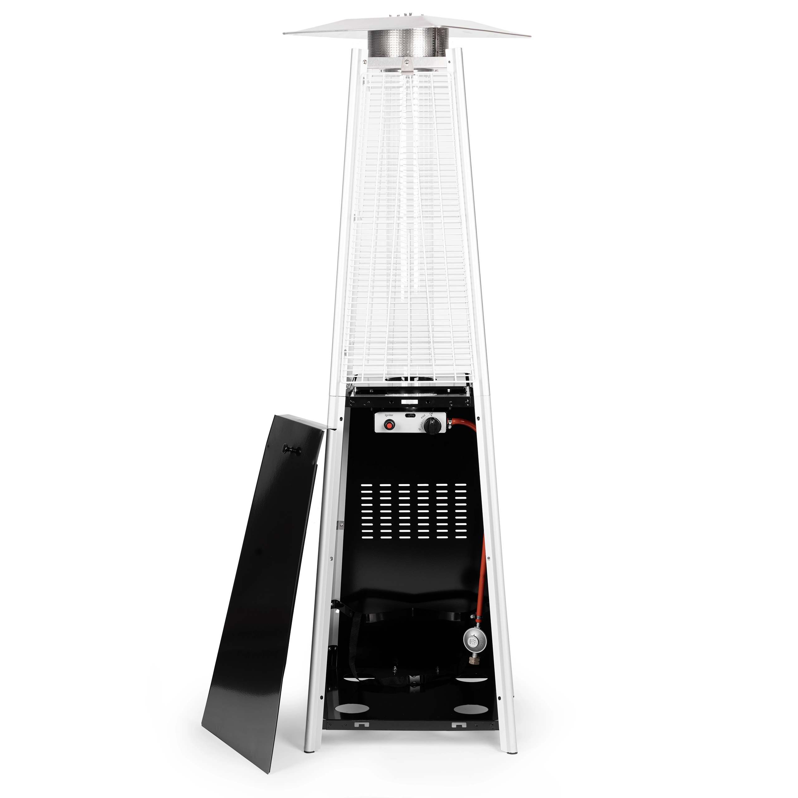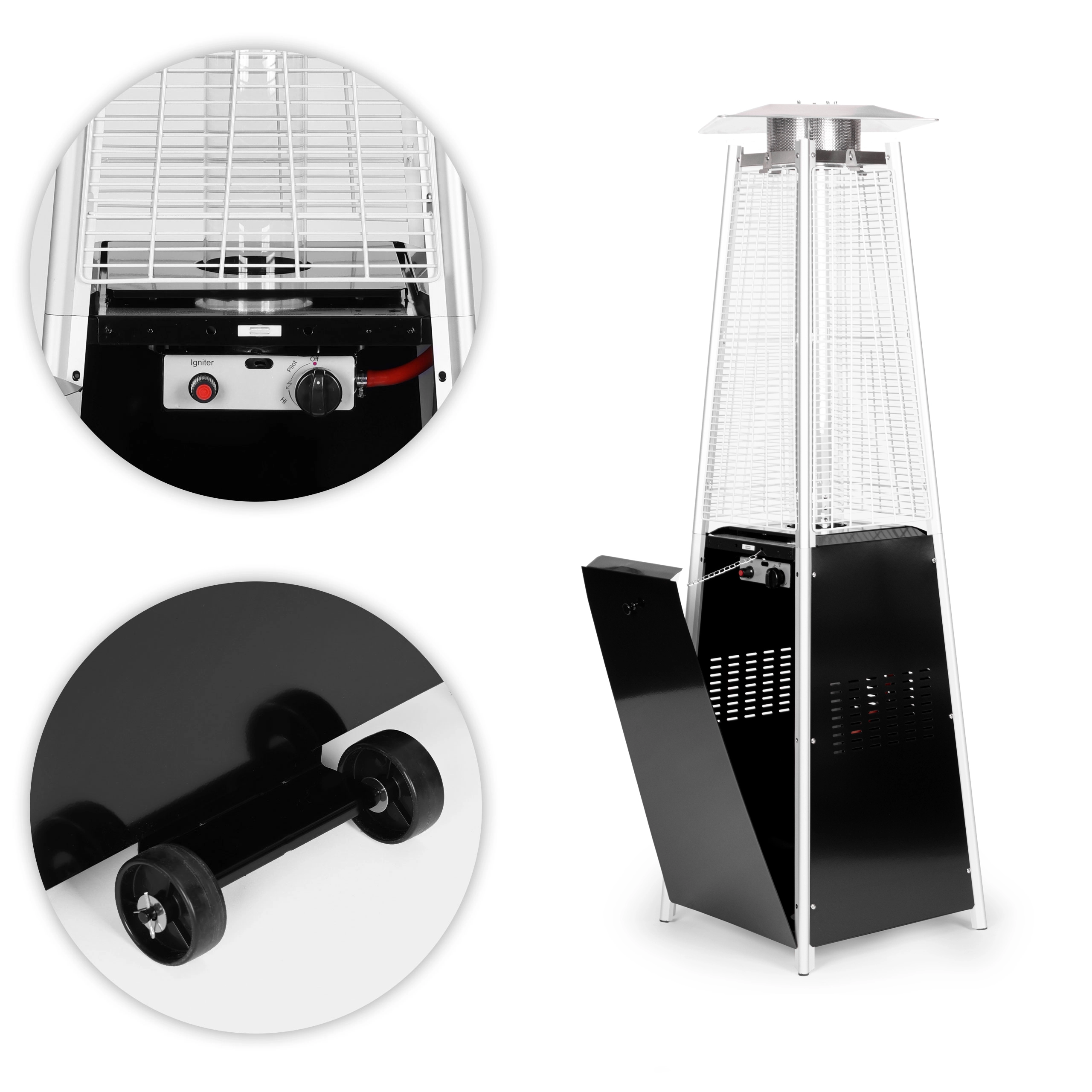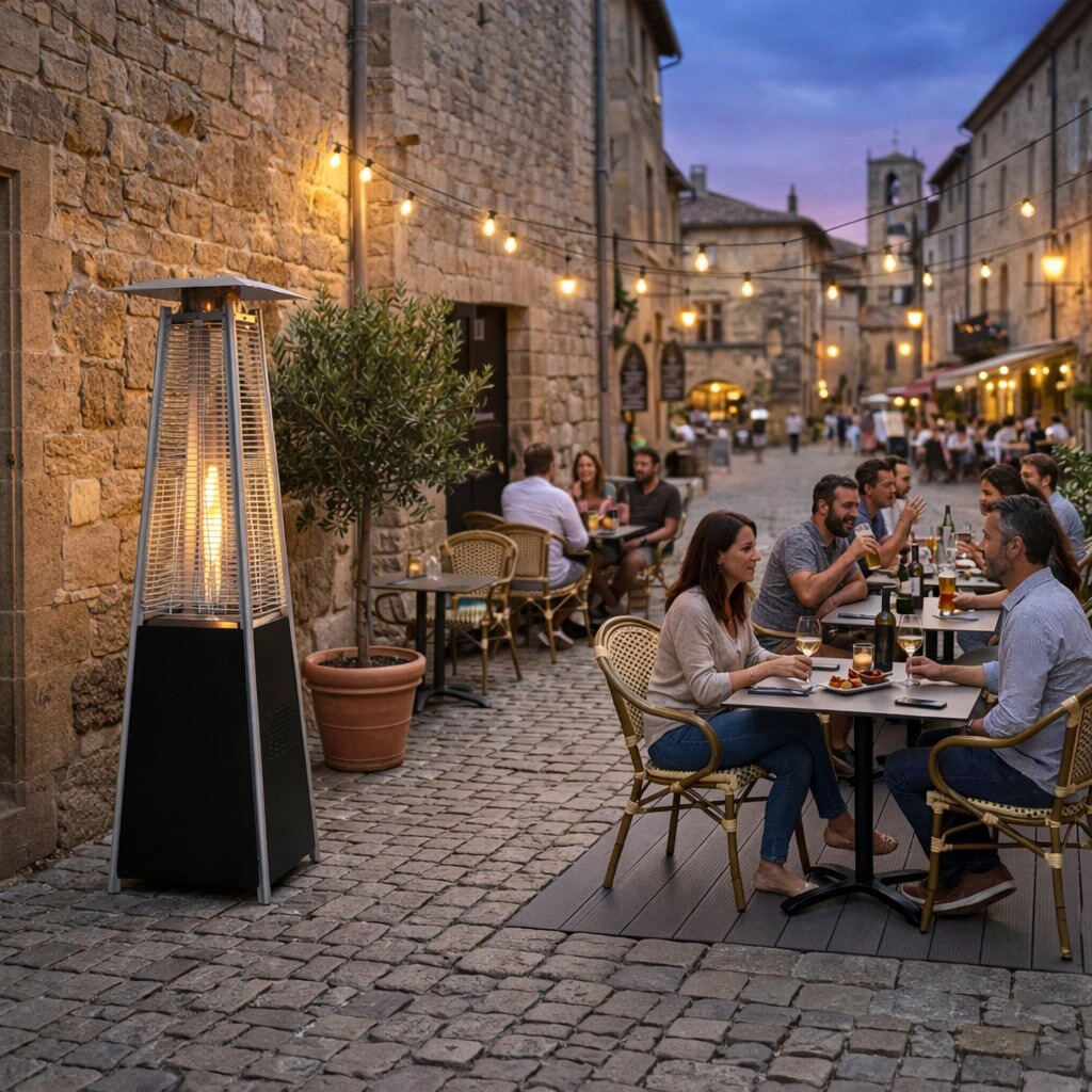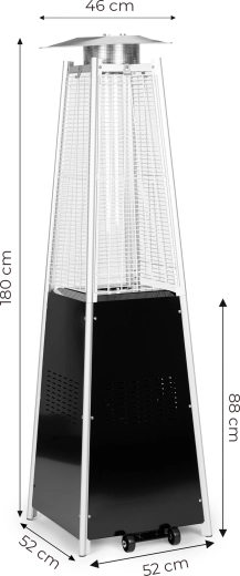 Výkonný hořák se skleněným štítem vytváří vysoký, viditelný plamen a sálavé teplo do všech směrů. Ideální pro terasy, zahrady i restaurační zahrádky.