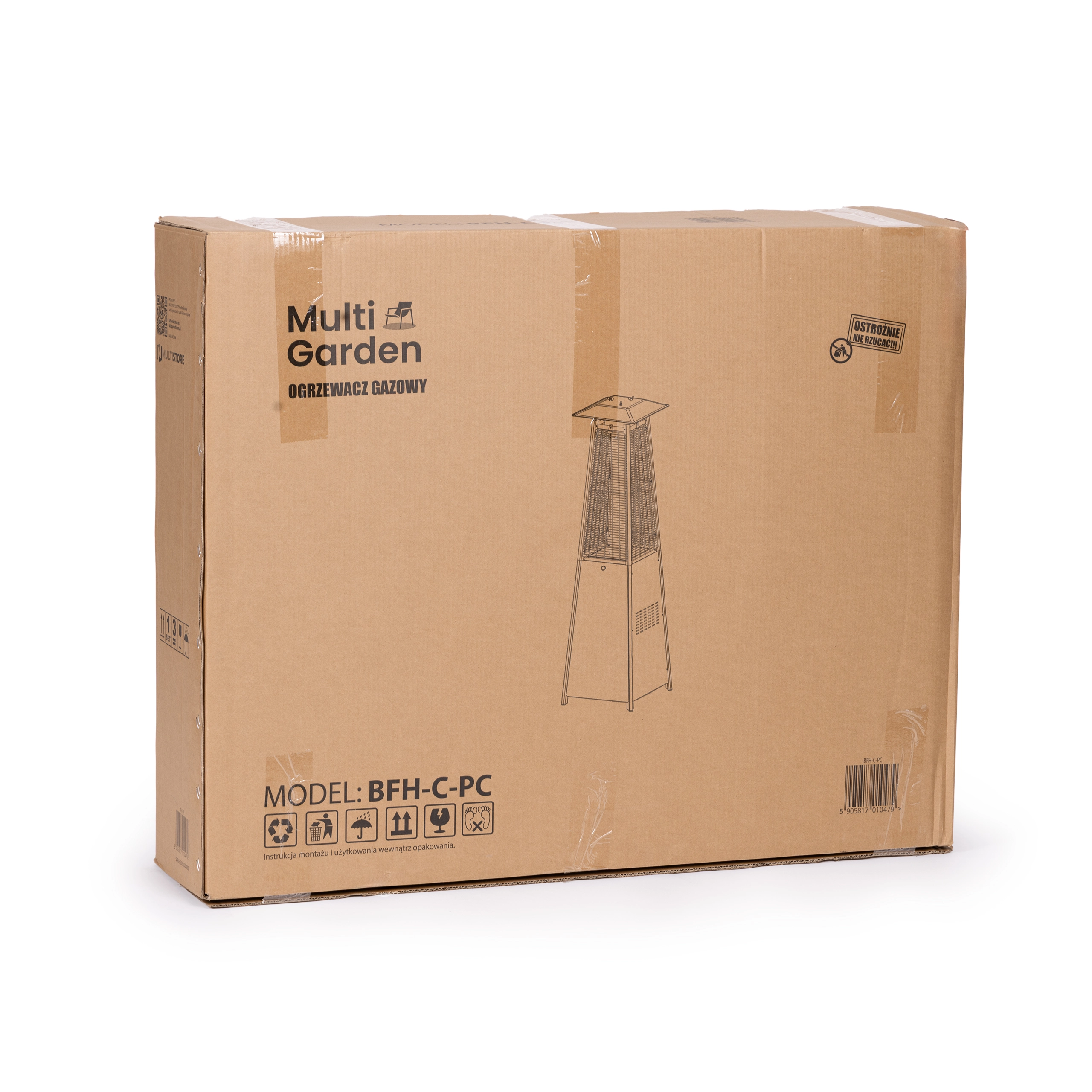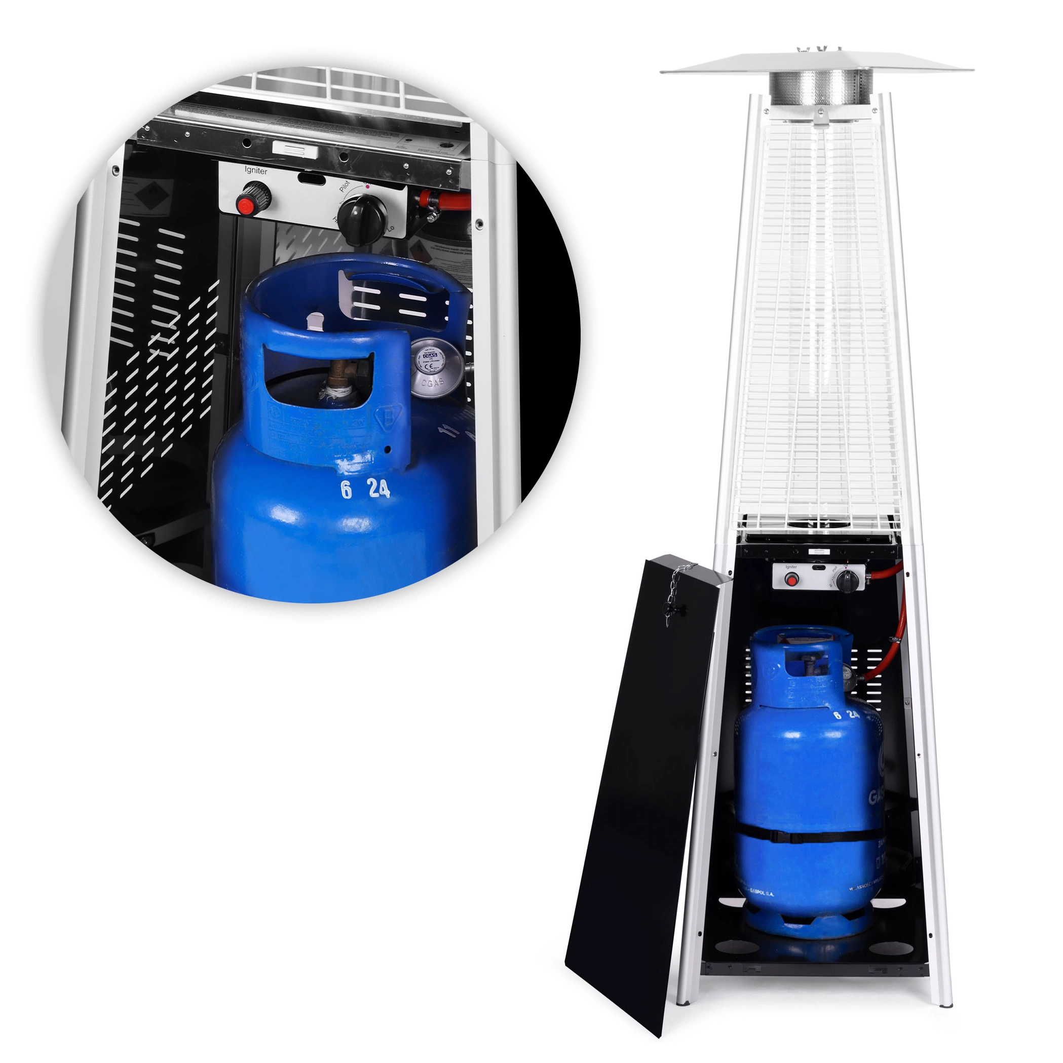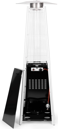 Pro maximální bezpečí má ohřívač uzamykatelný prostor na PB láhev (až 11 kg) se zabezpečovacím popruhem. Součástí balení je regulátor tlaku s hadicí a voděodolný obal pro ochranu před deštěm a prachem. Ideální řešení pro celoroční venkovní posezení.