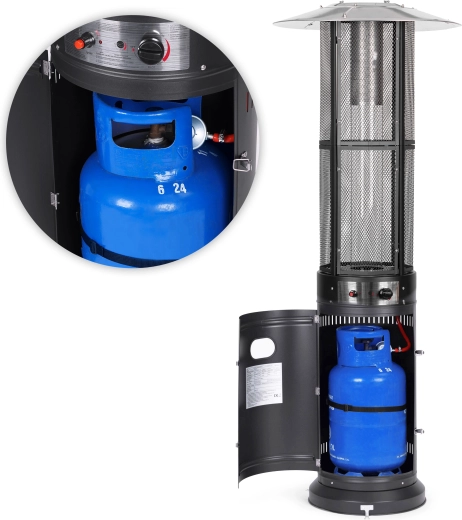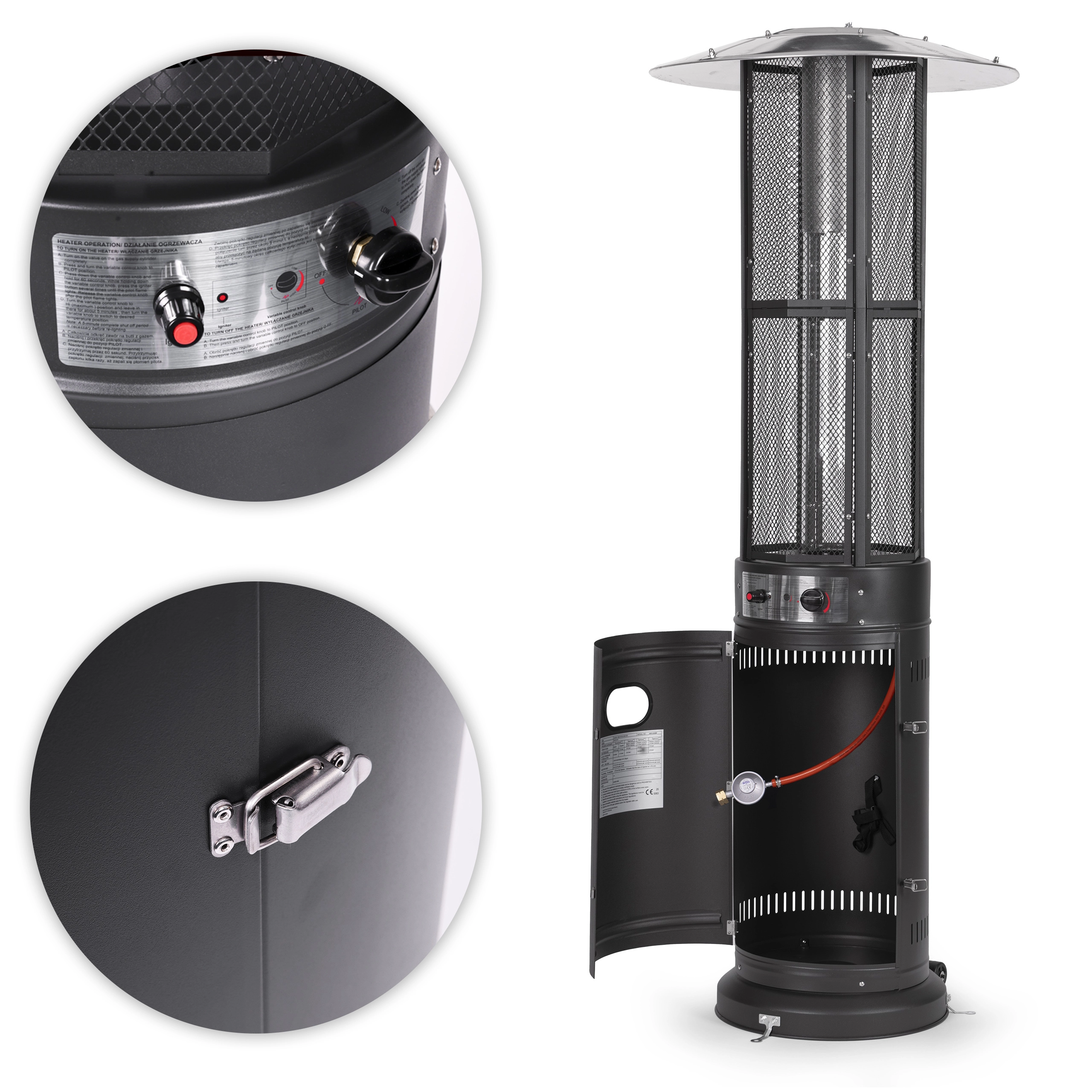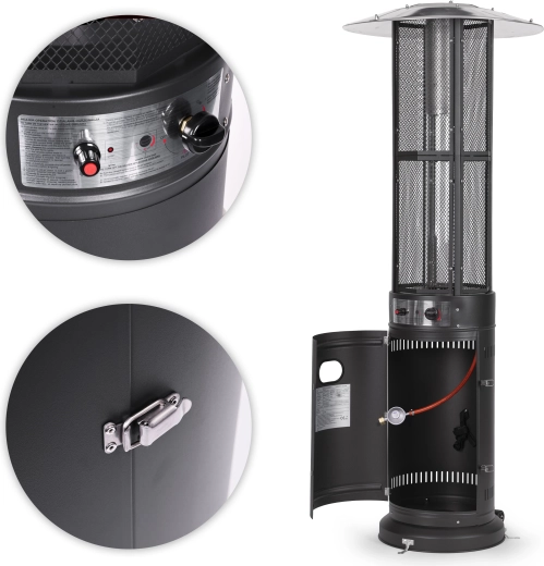 Ovládání je intuitivní: plynulá regulace plamene a elektrické zapalování (1× AAA, není součástí) umožní rychlý start a přesné nastavení intenzity. Uzavíratelná přihrádka pro plynovou láhev (až 11 kg) s magnetickými dvířky a fixačním popruhem zvyšuje bezpečí a estetiku. Kolečka usnadňují přesun, a pro stálé instalace jsou k dispozici kotvicí úchyty v základně.