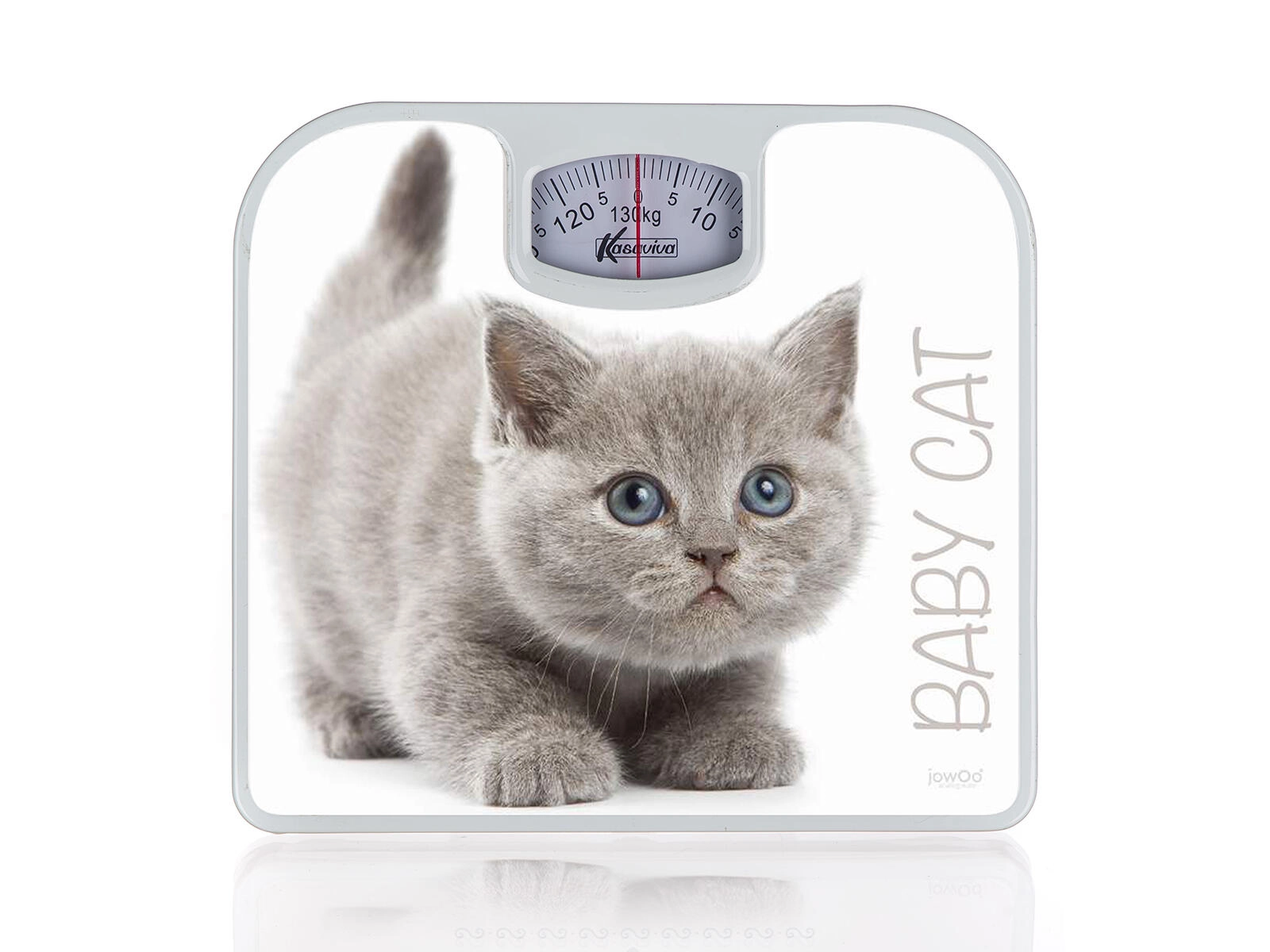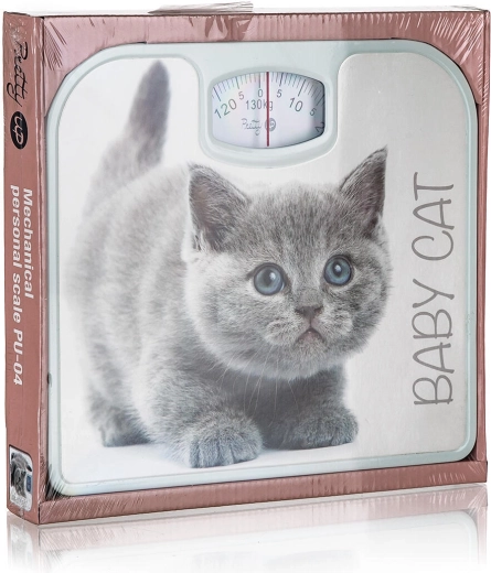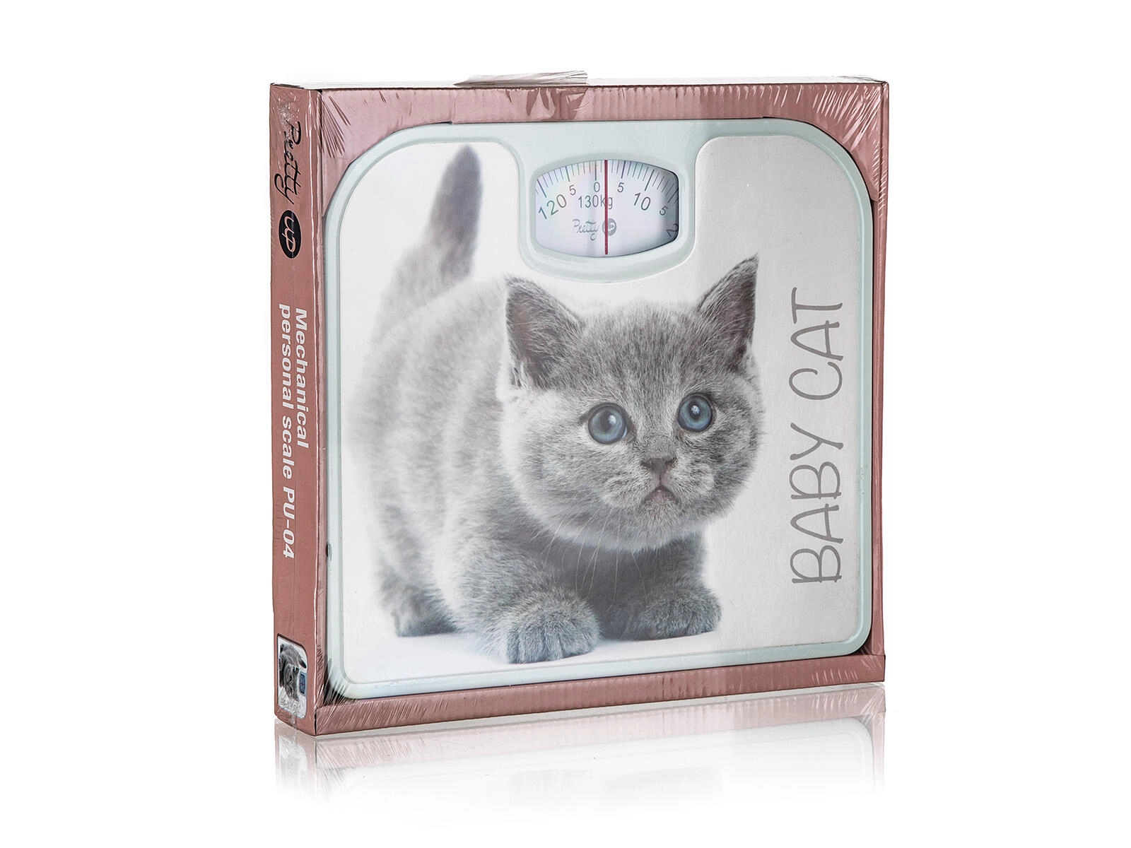Stylová osobní váha s roztomilým motivem koťátka zaujme svým klasickým mechanickým provedením a kompaktními rozměry. Nabízí maximální nosnost 130 kg, čitelné měřítko a kolečno pro snadné vynulování. Díky kovové konstrukci je odolná a ideální do každé domácnosti.