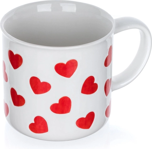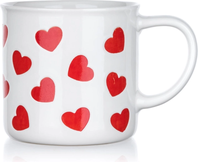 Dopřejte si chvíle pohody s romantickým hrnkem se srdíčky. Bílý keramický základ zdobí opakující se motiv červených srdcí, který dodá šmrnc každému stolování a je skvělý jako dárek z lásky i roztomilý doplněk domova.