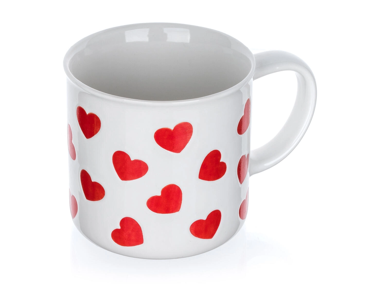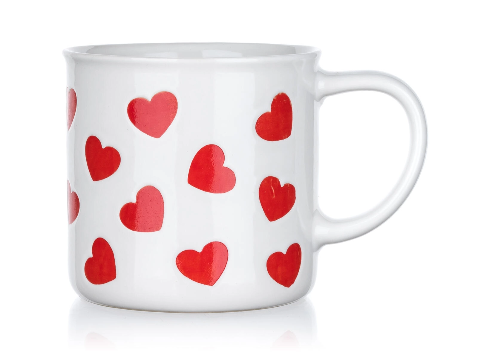 Opakující se motiv červených srdcí na bílé glazuře vytváří hravý a láskyplný vzhled – perfektní pro radost sobě i jako milý dárek.