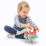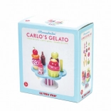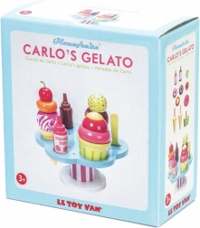 Hrací set Le Toy Van Carlo’s Gelato přináší dětem nekonečnou porci zábavy a fantazie. Obsahuje kornoutky i kelímek, odnímatelné kopečky, dvě omáčky a posypky, nechybí ani lžička. Je vyroben z udržitelného FSC dřeva, je ručně domalovaný netoxickými barvami na vodní bázi a podporuje jemnou motoriku, kognitivní dovednosti i hru na role.