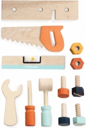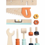 Pilka, kladivo, šroubovák, klíč, vodováha, šrouby, vruty, hřebíky a destička – příslušenství přesně padnoucí do dětských rukou.