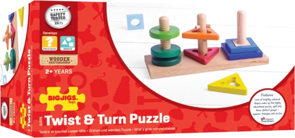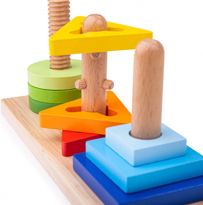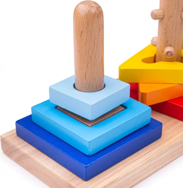 Tato chytrá dřevěná hračka děti motivuje k objevování. Dílky se nasazují na tři různé kolíčky, přičemž některé vyžadují otočení nebo správnou orientaci. Děti tak přirozeně trénují obratnost prstů, trpělivost a prostorovou představivost.
