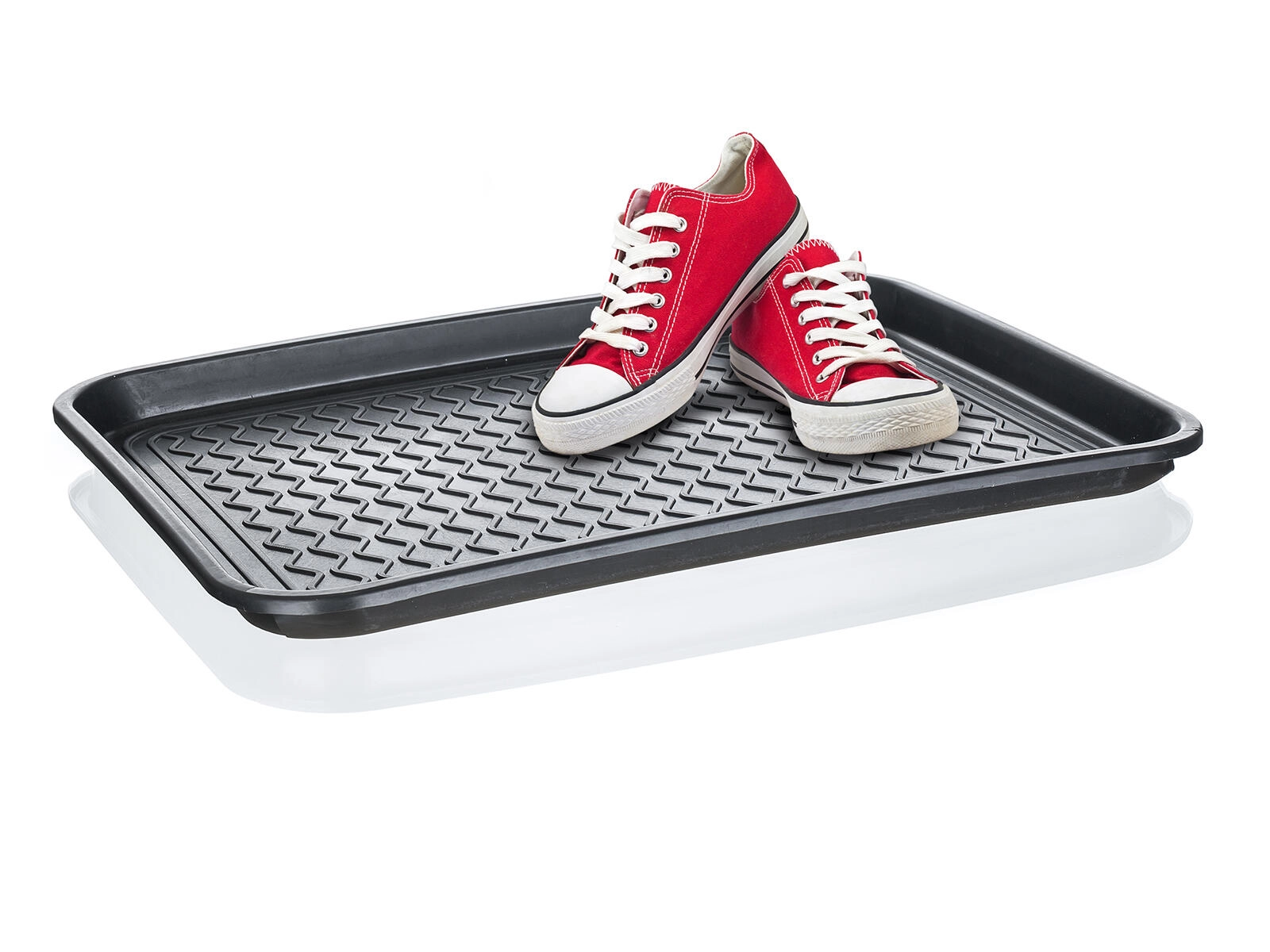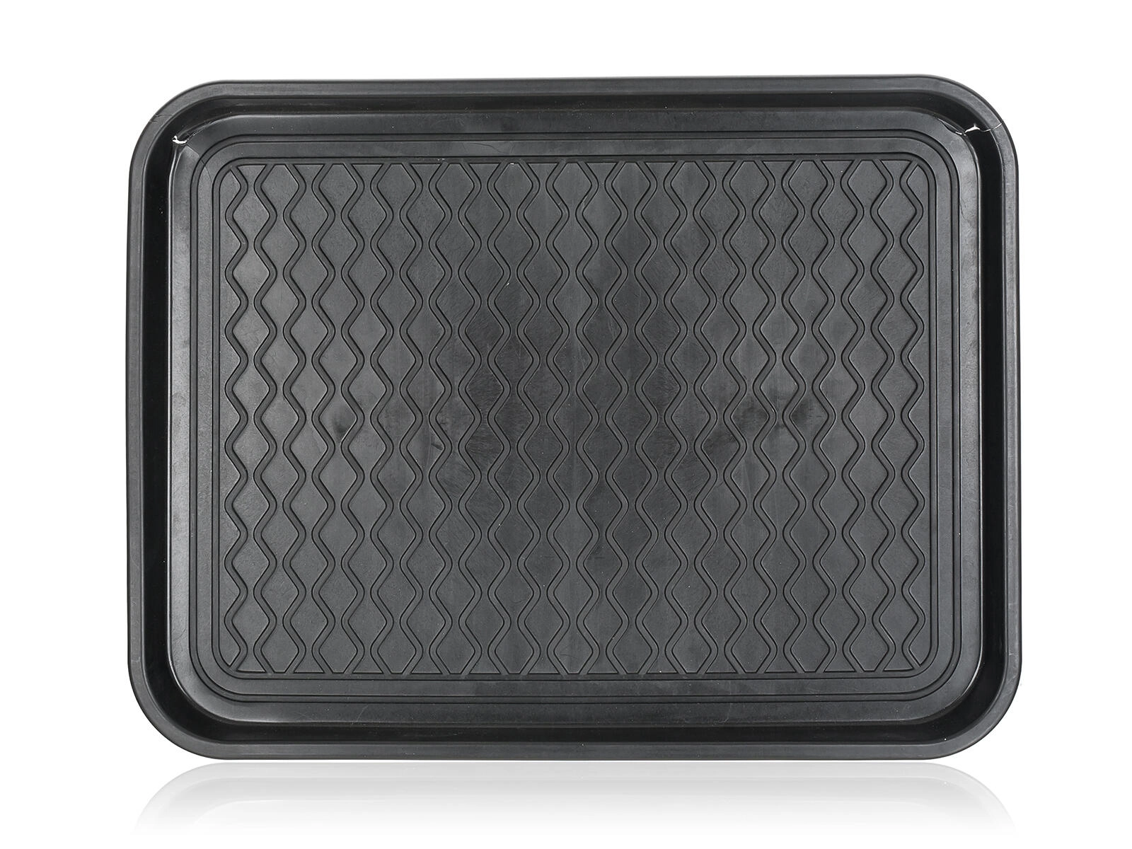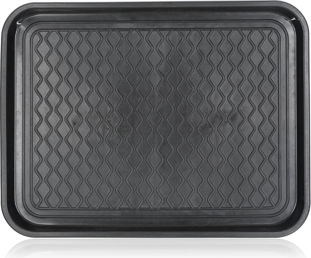 Praktický odkapávač na obuv o rozměrech 50 × 38 cm z odolného recyklovatelného plastu v elegantní černé barvě. Spolehlivě zachytí vodu, sníh a nečistoty z bot a udrží vaši podlahu čistou – ideální do předsíně i do kufru auta.