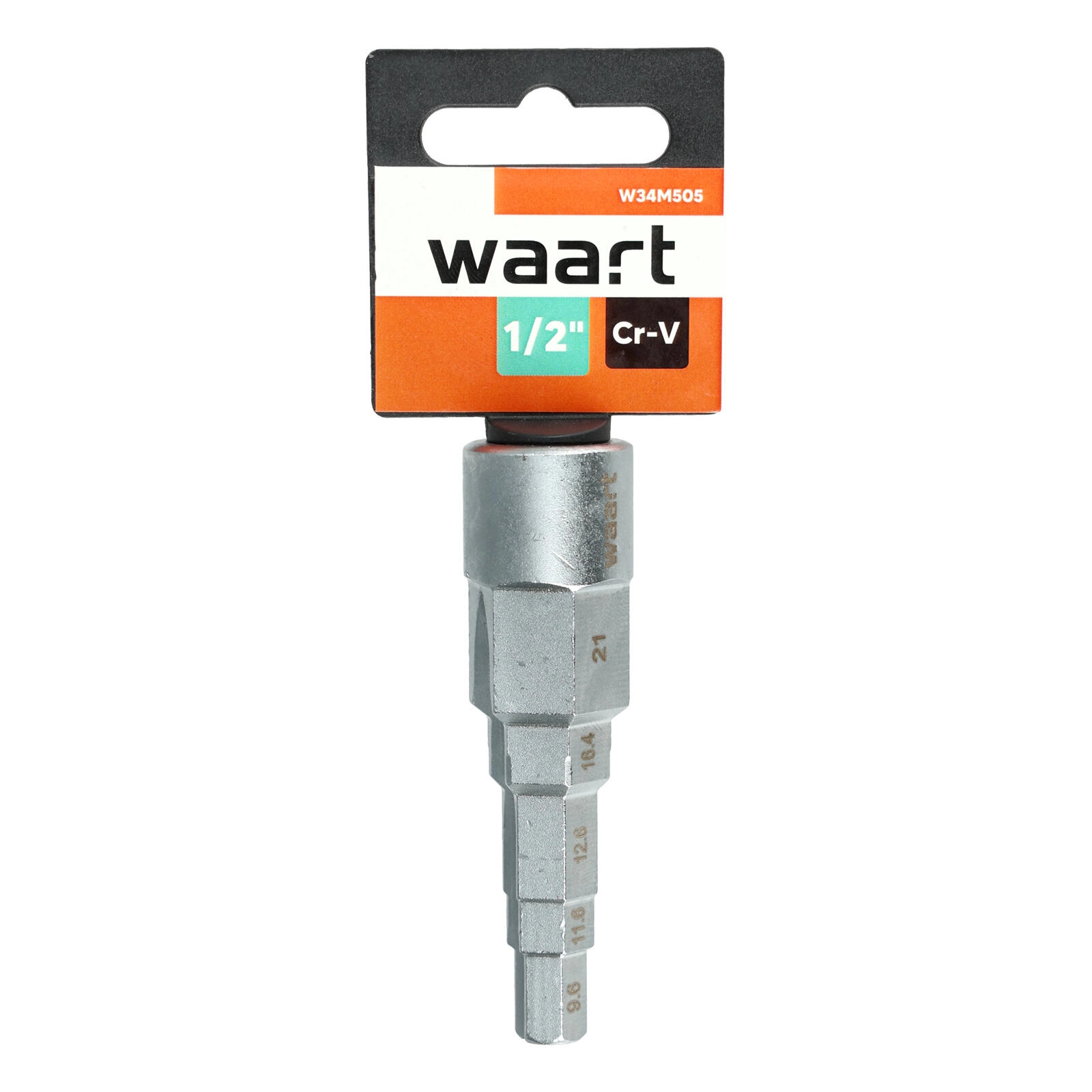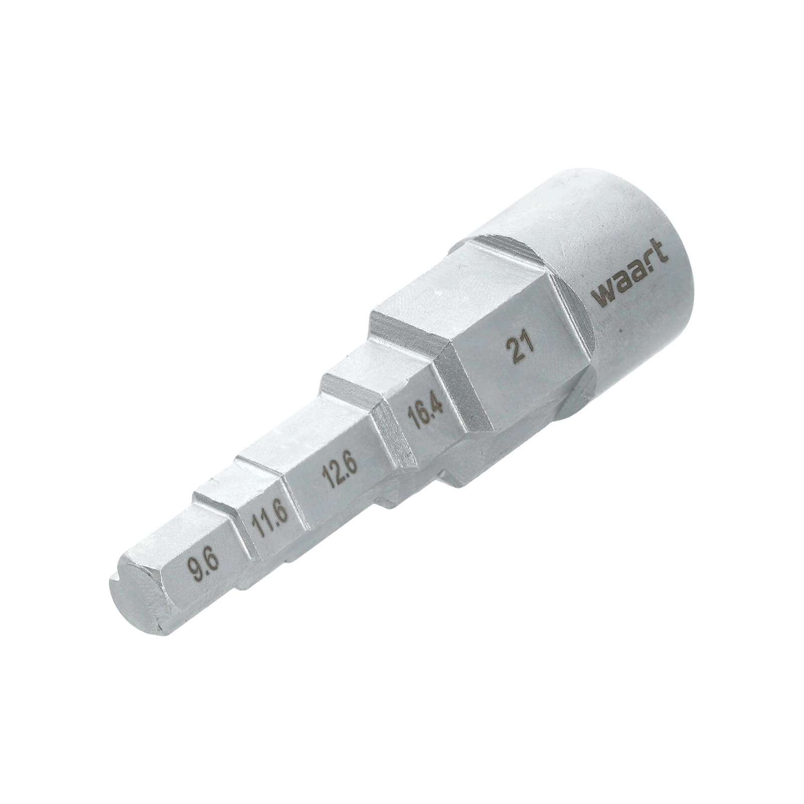 Stupňovitý design umožňuje rychlé přepínání mezi rozměry 3/8", 29/68", 1/2", 21/32" a 27/32" (9,6–21 mm) bez nutnosti měnit nástroj.