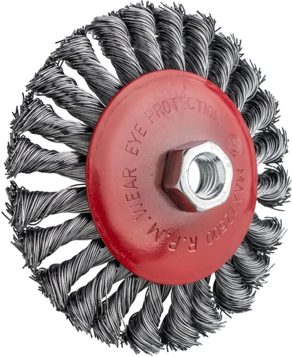 Výkonný miskový kartáč pro úhlové brusky s uchycením M14 určený k odstraňování rzi, starých nátěrů a silných nečistot. Díky kroucenému ocelovému drátu 0,3 mm nabízí agresivní čištění a dlouhou životnost, zatímco miskový tvar usnadňuje práci i v těžko přístupných místech.