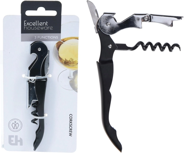 Praktický číšnický otvírák s 3 funkcemi je ideální pro domácnost, bar i piknik. Kombinuje vývrtku, otvírák na korunkové uzávěry a řezačku fólie. Odolné kovové provedení a kompaktní rozměry zajišťují dlouhou životnost a pohodlné nošení v kapse.