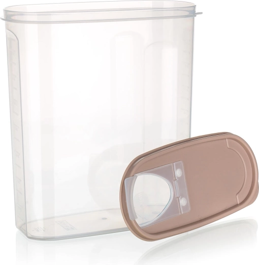 Praktická transparentní dóza na sypké potraviny Riva o objemu 4 l s hnědým víčkem je ideální pro skladování těstovin, rýže, mouky či luštěnin. Díky průhlednému tělu máte vždy přehled o obsahu a množství, zatímco víko s praktickým otvíracím výklopem umožňuje pohodlné dávkování a zajišťuje čerstvost a ochranu před vlhkostí. Robustní plastové provedení je lehké, odolné a snadno udržovatelné.