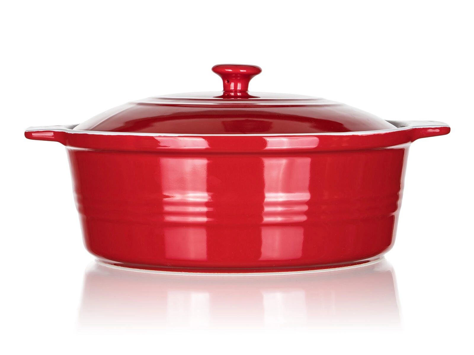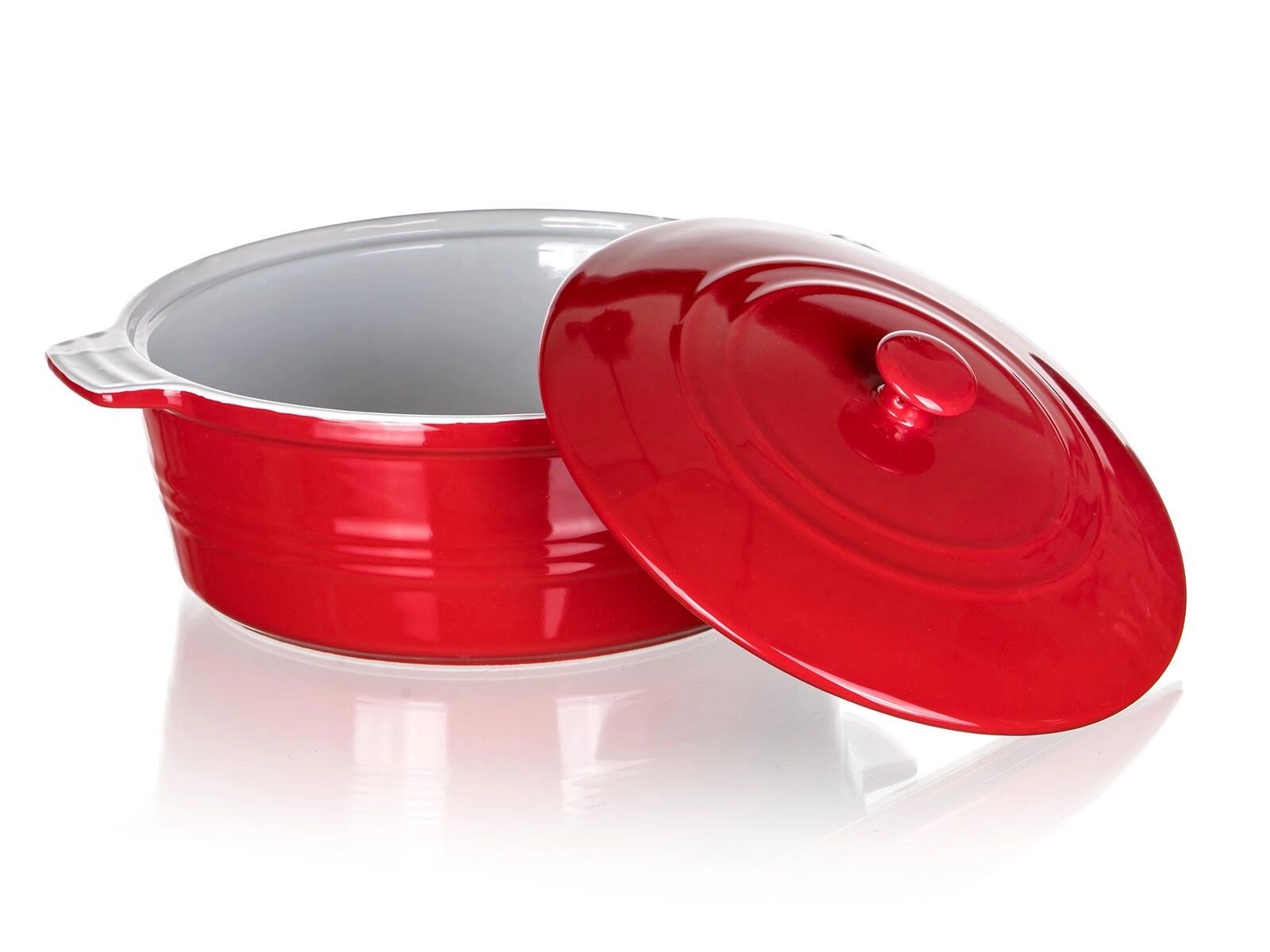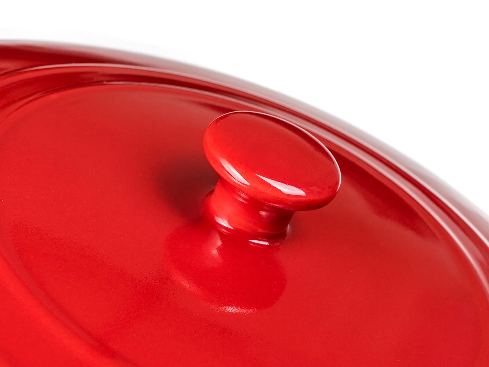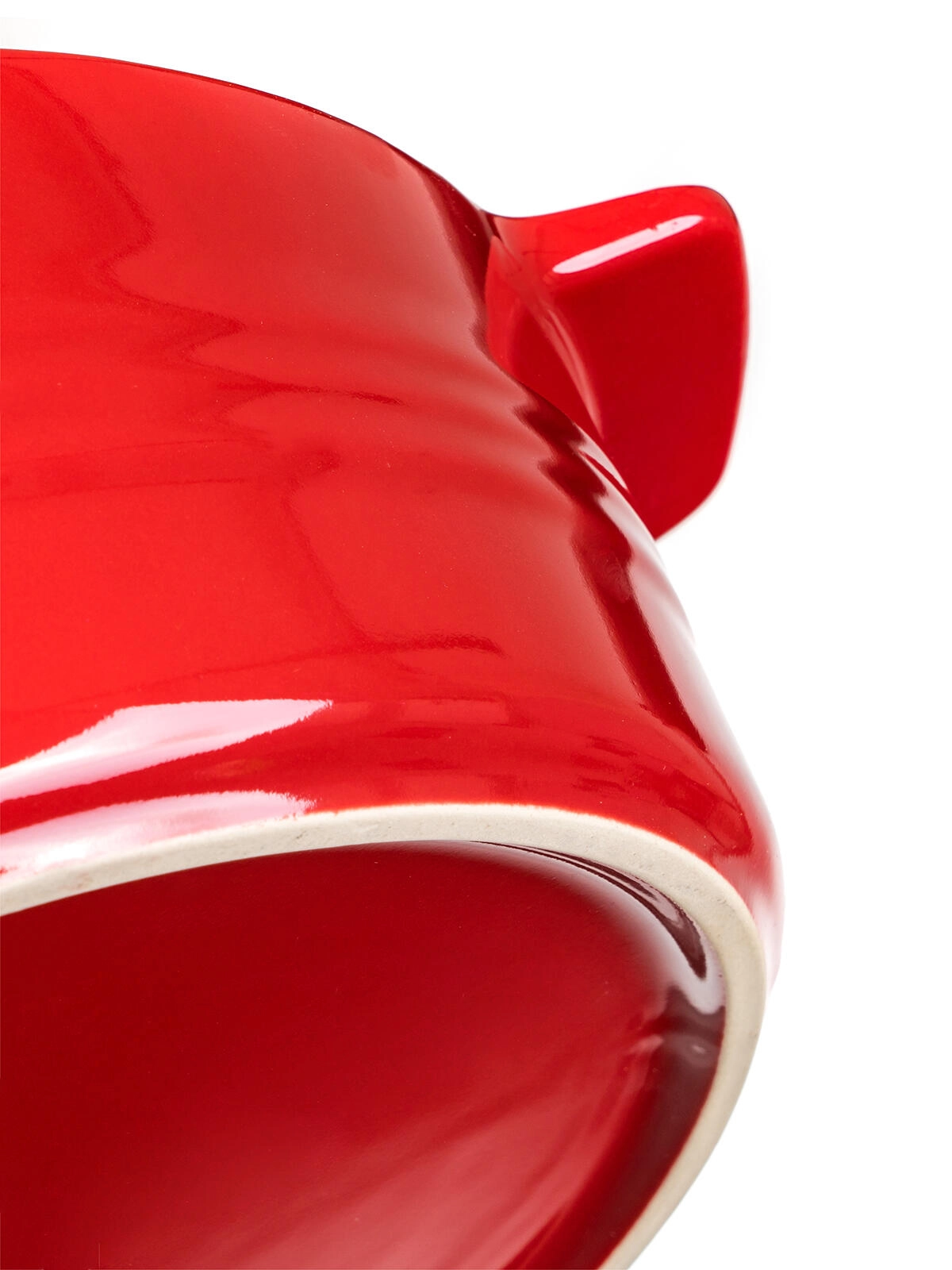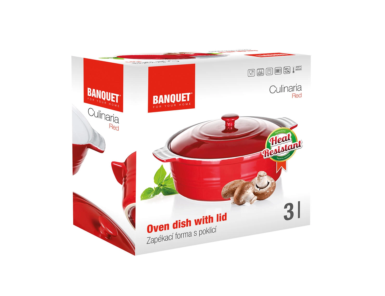 Praktická držadla umožňují jistý úchop při přenášení, víko pomáhá udržet vlhkost a aroma a chrání pokrmy před osycháním. Hladká glazura usnadňuje čištění a údržbu. Forma není určena pro použití na varné desce.