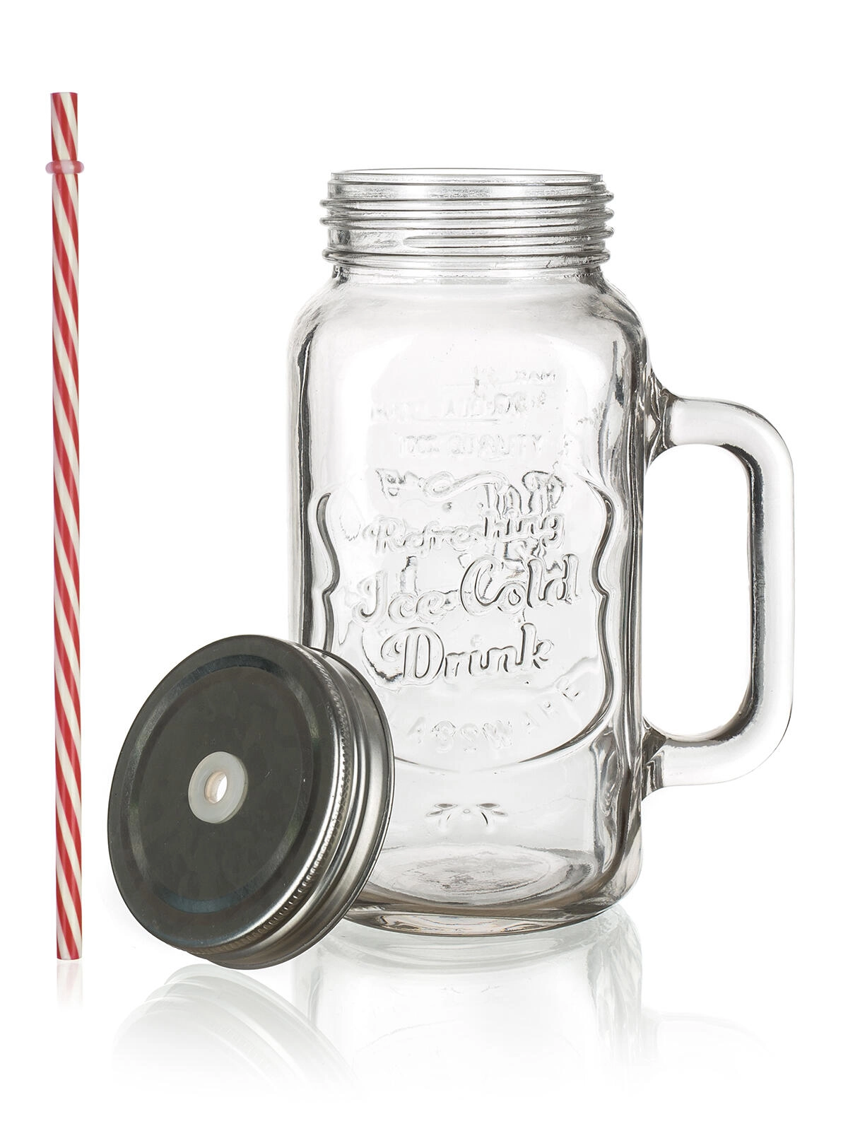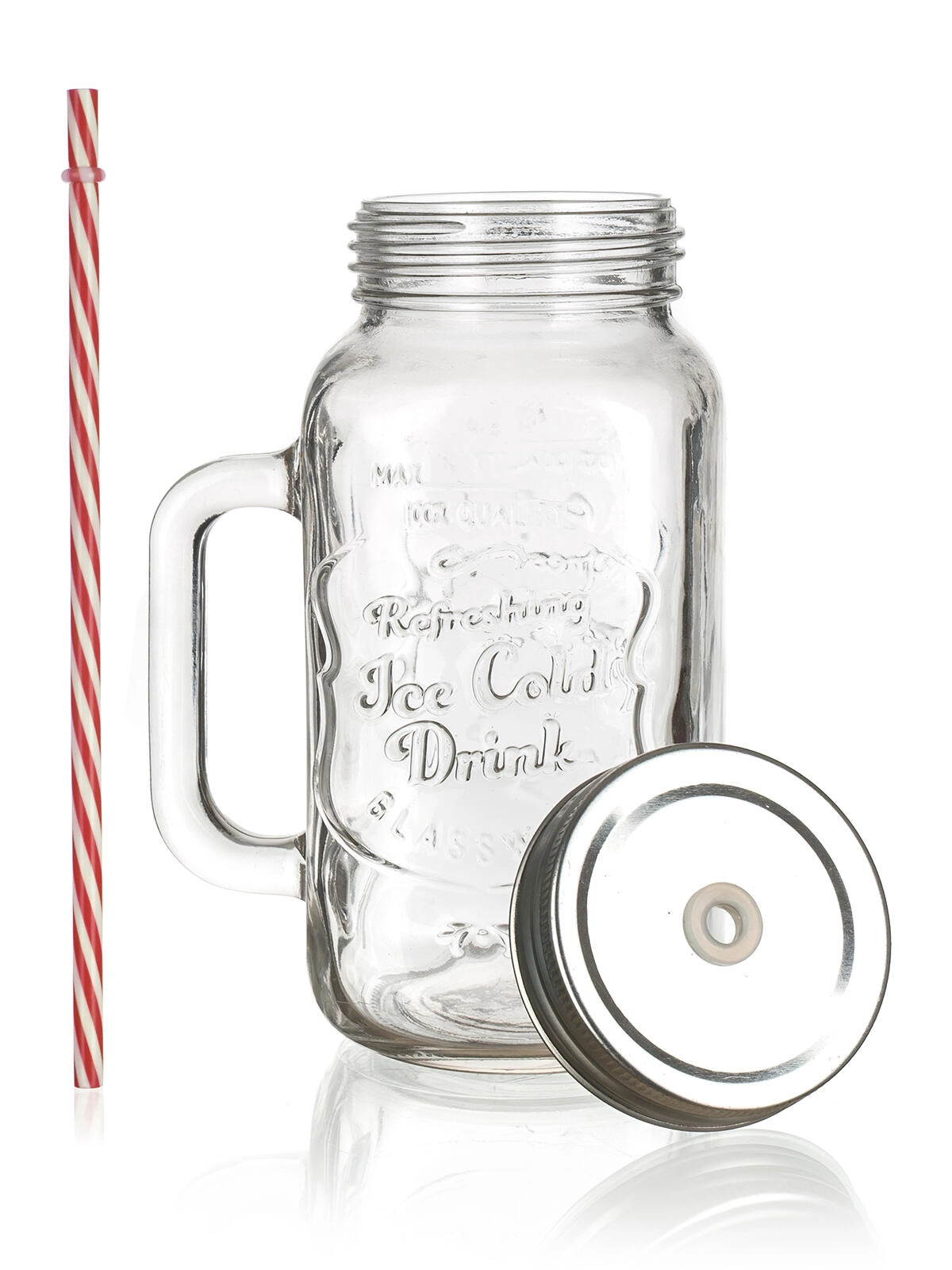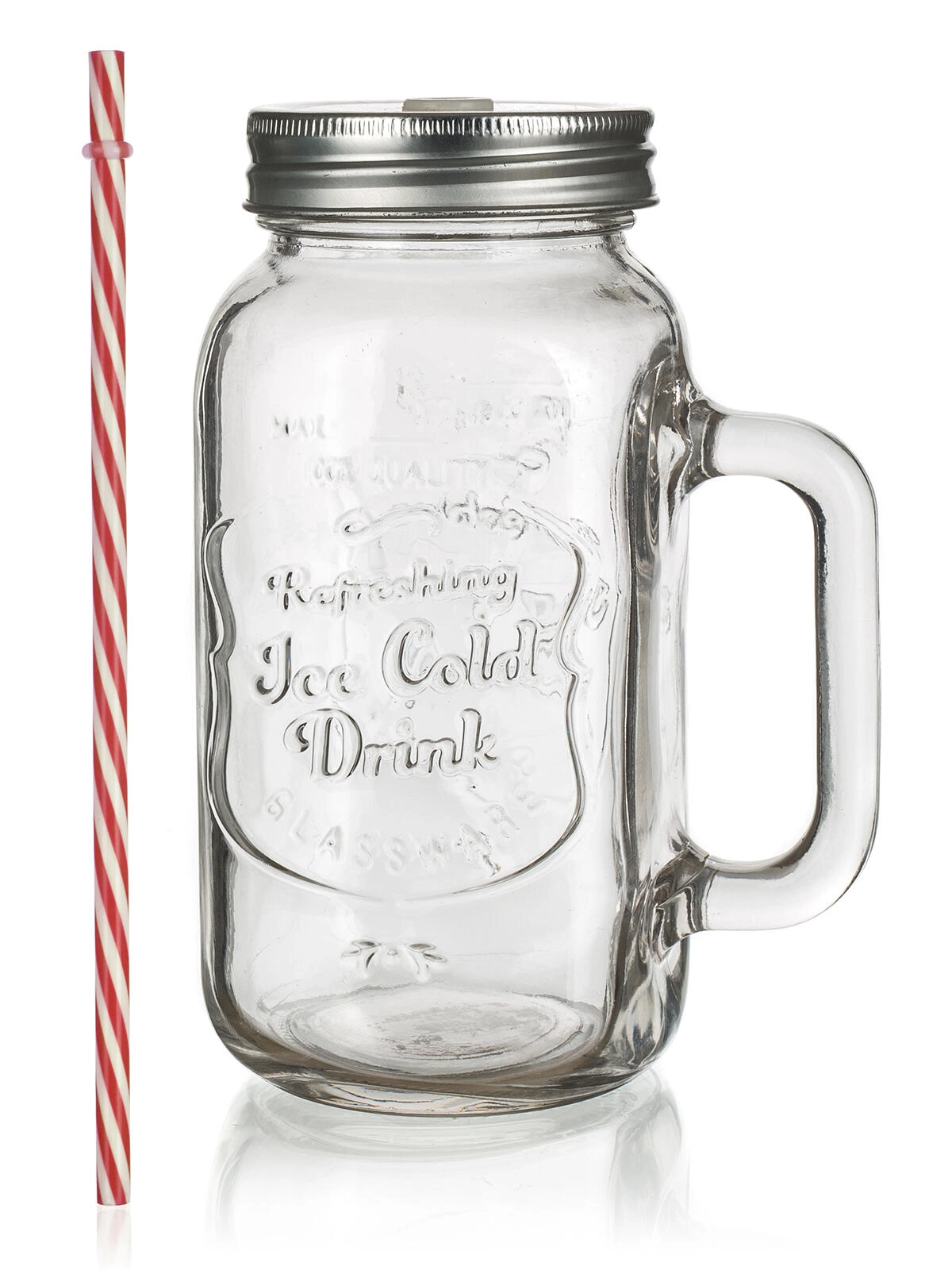 Stylový skleněný hrnek MADEIRA o objemu 700 ml s uchem, šroubovacím kovovým víčkem a opakovaně použitelným brčkem je ideální pro letní nápoje. Užijte si své oblíbené limonády, ledové čaje a koktejly bez rozlití díky víčku s otvorem na brčko a pohodlnému držení za ucho. Velký objem 700 ml, praktické víčko proti rozlití a elegantní design z něj dělají perfektní doplněk pro zahradní slavnosti, letní párty i svatby.
