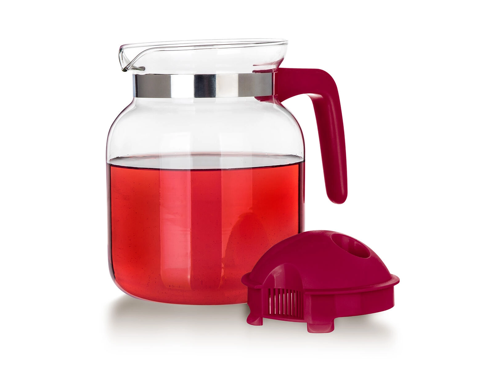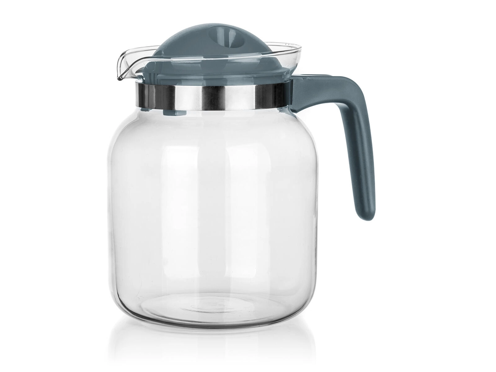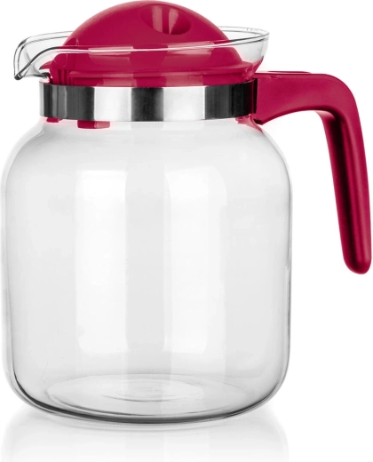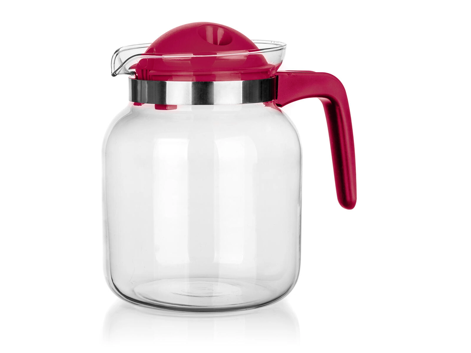 Praktická skleněná konvice o objemu 1,45 l s plastovým víčkem a ergonomickou rukojetí pro pohodlné nalévání. Odolné sklo do 100 °C je ideální pro servírování čaje, kávy, vody či domácích limonád. K dispozici v šedé a bordó barvě, s odnímatelným víčkem se zachytávačem/filtračními otvory pro čisté a plynulé nalévání.