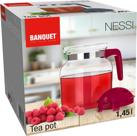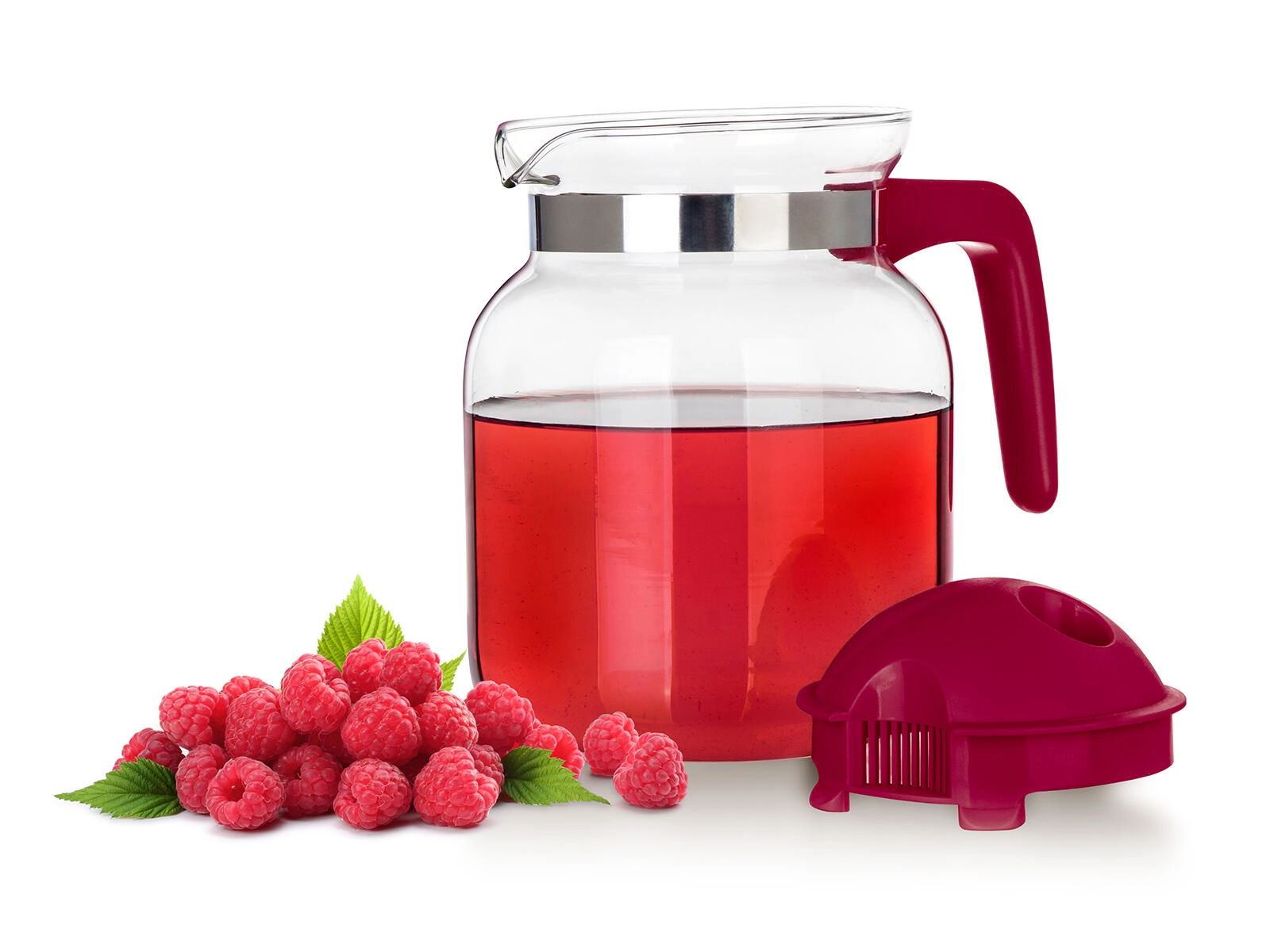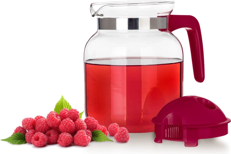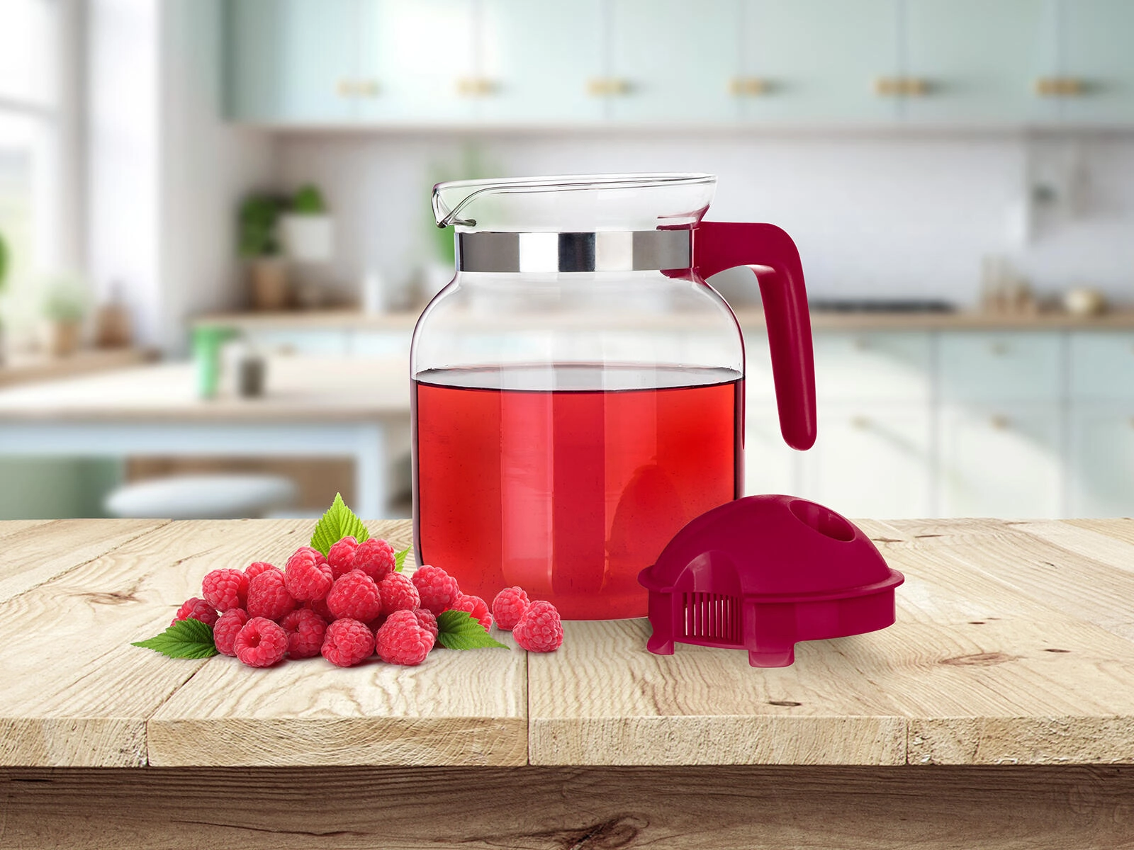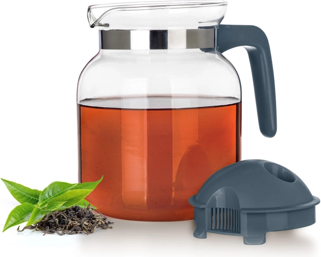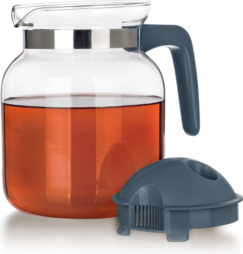 Praktická skleněná konvice o objemu 1,45 l s plastovým víčkem a ergonomickou rukojetí pro pohodlné nalévání. Odolné sklo do 100 °C je ideální pro servírování čaje, kávy, vody či domácích limonád. K dispozici v šedé a bordó barvě, s odnímatelným víčkem se zachytávačem/filtračními otvory pro čisté a plynulé nalévání.