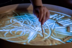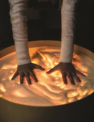 Na desce lze kreslit prsty, štětci i plastovými nástroji, pracovat s pískem, kamínky a dalšími materiály bez obav z nepořádku díky vyvýšené hraně. Stůl poslouží i jako světelná scéna pro malé divadlo, dekorativní osvětlení dětského pokoje či terapeutický nástroj pro rozvoj barevného vnímání, tvarů a vzorů.