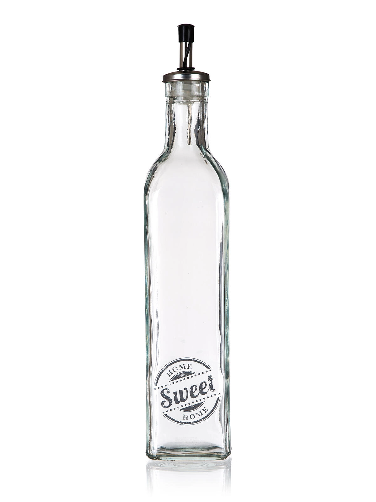 Stylová skleněná láhev na olej s dekorem SWEET HOME o objemu 500 ml je praktický doplněk do každé kuchyně. Má hranatý tvar pro stabilitu a pohodlné uchopení, je vybavena kovovou nálevkou s plastovým uzávěrem a těsněním pro čisté a přesné dávkování bez kapání.