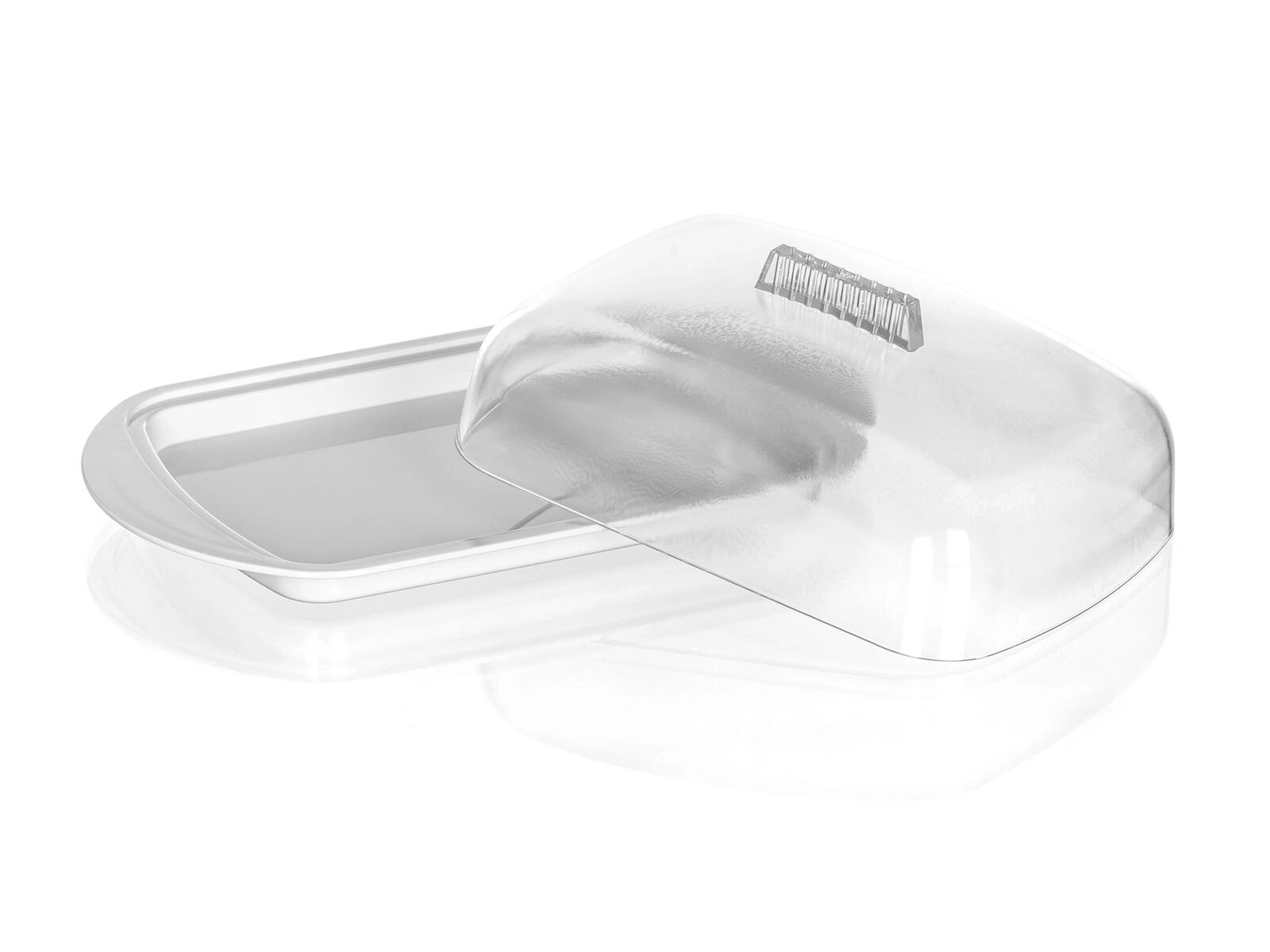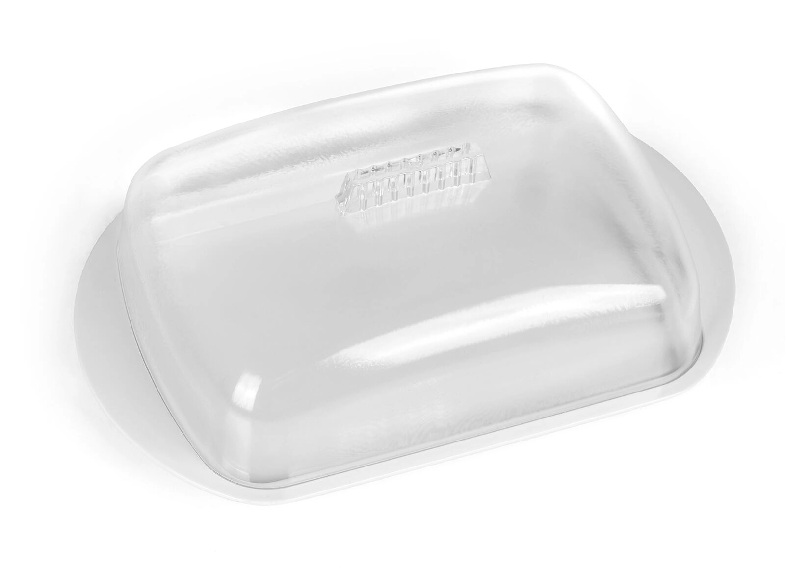 Domkovité čiré víko s rýhovaným úchopem chrání máslo před pachy a nečistotami, zároveň umožňuje okamžitou vizuální kontrolu stavu a množství.