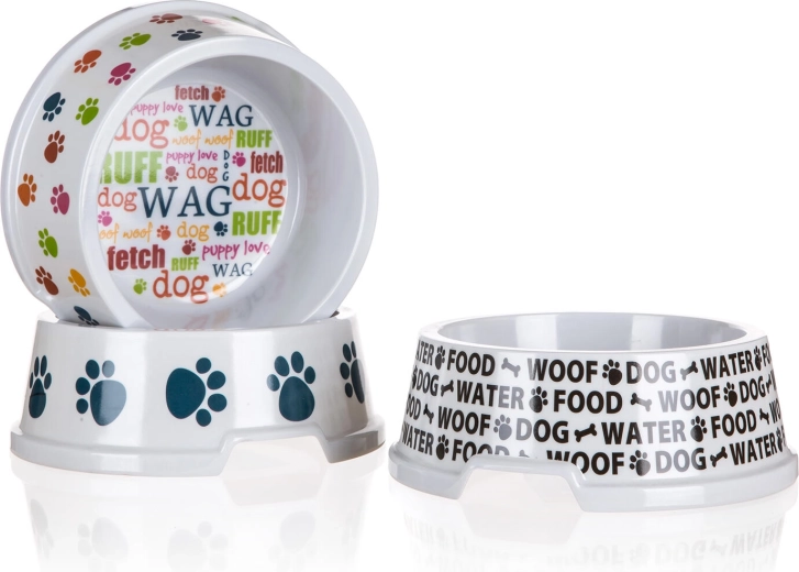 Praktická psí miska o průměru 16,5 cm z odolného plastu je vhodná na krmivo i vodu. Díky konickému tvaru je stabilní, omezí převrhnutí a praktická výseč usnadňuje uchopení. Dostupná v mixu dekorů pro snadné sladění s vaším interiérem.