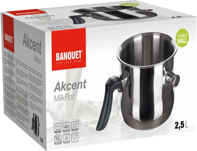 Nerezový mlékovar AKCENT s objemem 2,5 l je navržený pro šetrné vaření potravin, které se snadno připálí. Dvojstěnná konstrukce umožňuje vaření ve vodní lázni: do vnější nádoby se otvorem pro píšťalu nalije voda, která po dosažení varu spustí akustickou signalizaci. Vaření je tak kontrolované a rovnoměrné.