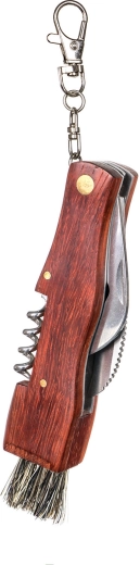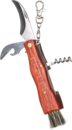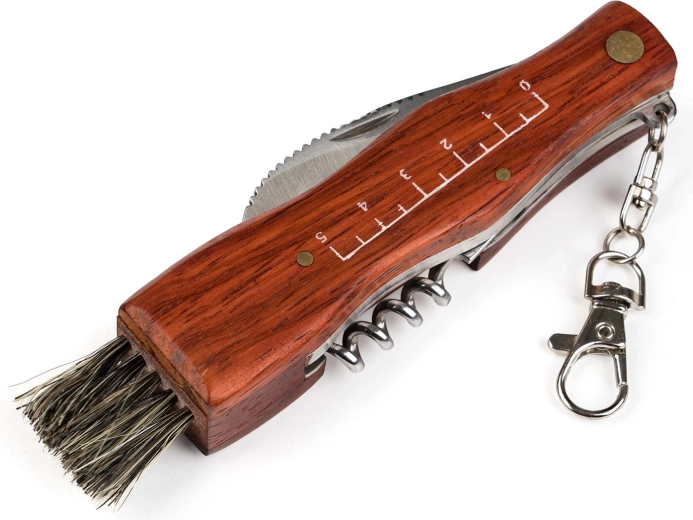 Dřevěná rukojeť dodává příjemný úchop a odolnost, zatímco skládací provedení zajišťuje bezpečné a kompaktní přenášení. Nechybí ani vývrtka, která se hodí na cesty i pikniky.