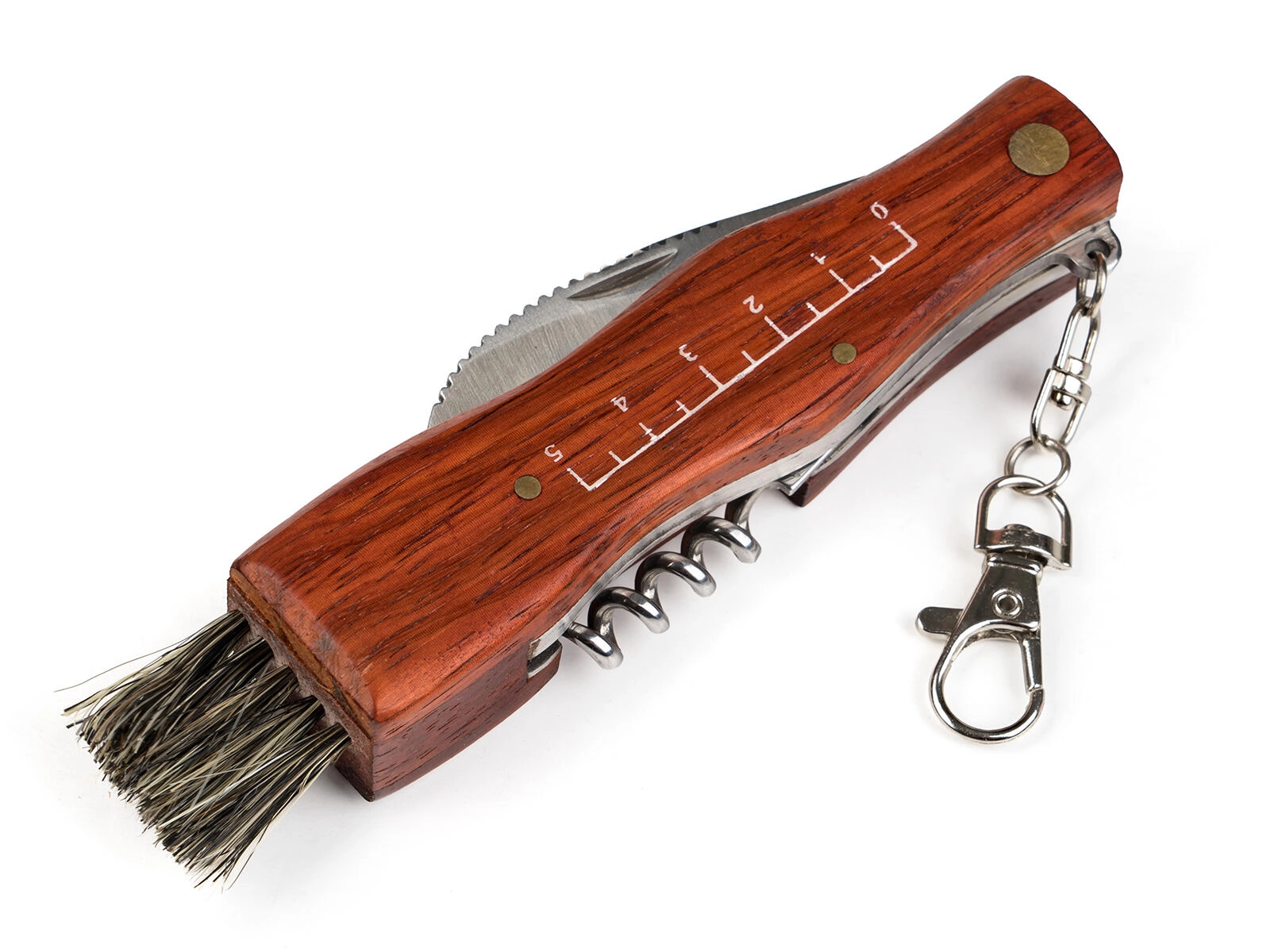 • Multifunkční výbava: čepel 7 cm, štěteček, vývrtka, karabinka.