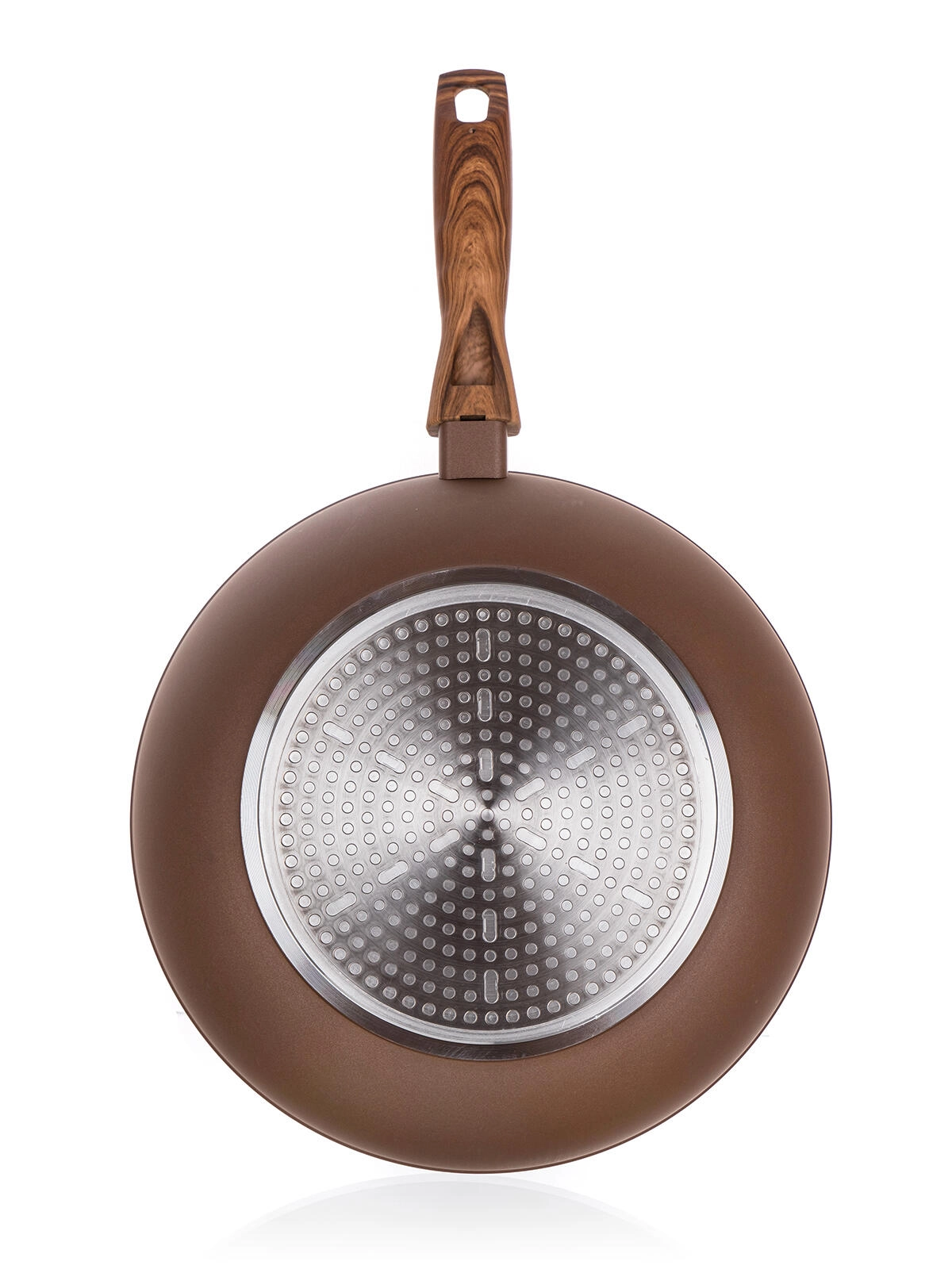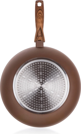 Stabilní indukční dno zajišťuje rovnoměrnou distribuci tepla na všech typech sporáků, zatímco měkčená bakelitová rukojeť se soft touch povrchem v imitaci dřeva nabízí jistý a pohodlný úchop. Vnější žáruvzdorný nástřik zvyšuje odolnost při každodenním používání.