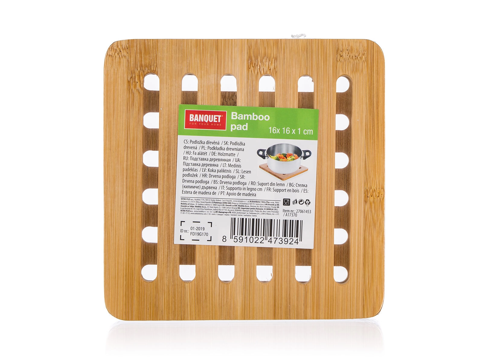 Praktická bambusová podložka BRILLANTE o rozměrech 16 × 16 × 1 cm chrání pracovní desky a stoly před teplem i poškrábáním. Díky větracím otvorům zajišťuje rychlé odvádění tepla, je lehké a odolné provedení z přírodního bambusu a hodí se pro horké i studené pokrmy a nápoje.