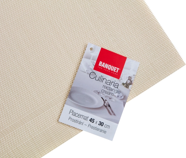 Stylové a praktické prostírání RECTANGLE v krémové barvě dodá vašemu stolu moderní vzhled a ochranu. Vyrobené z odolné směsi PVC a PES, snadno se udržuje, je odolné proti skvrnám a vhodné pro každodenní použití. Díky rozměrům 45 × 30 cm perfektně padne pod talíře a příbory a chrání povrch stolu.