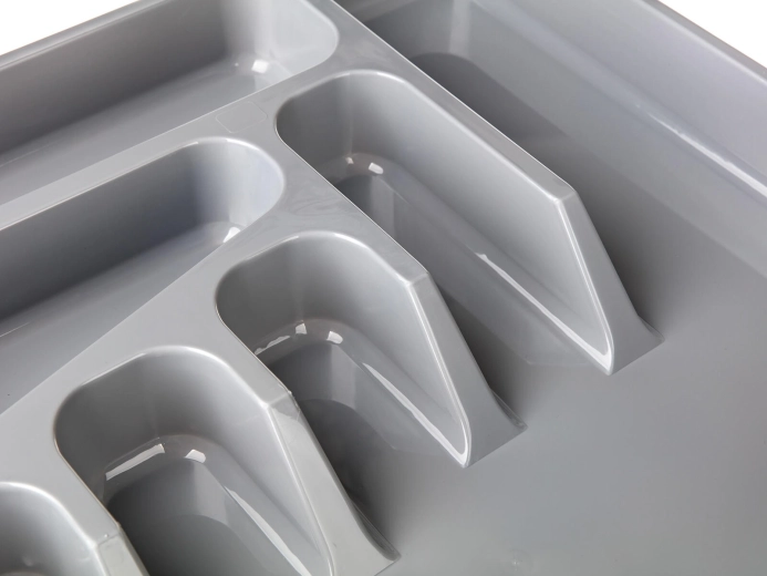 Materiál je odolný, lehký a snadno omyvatelný, takže údržba zabere minimum času. Nízký profil umožňuje stabilní uložení v zásuvce bez zbytečného klouzání, zatímco čistý šedý design se hodí do každé moderní kuchyně.