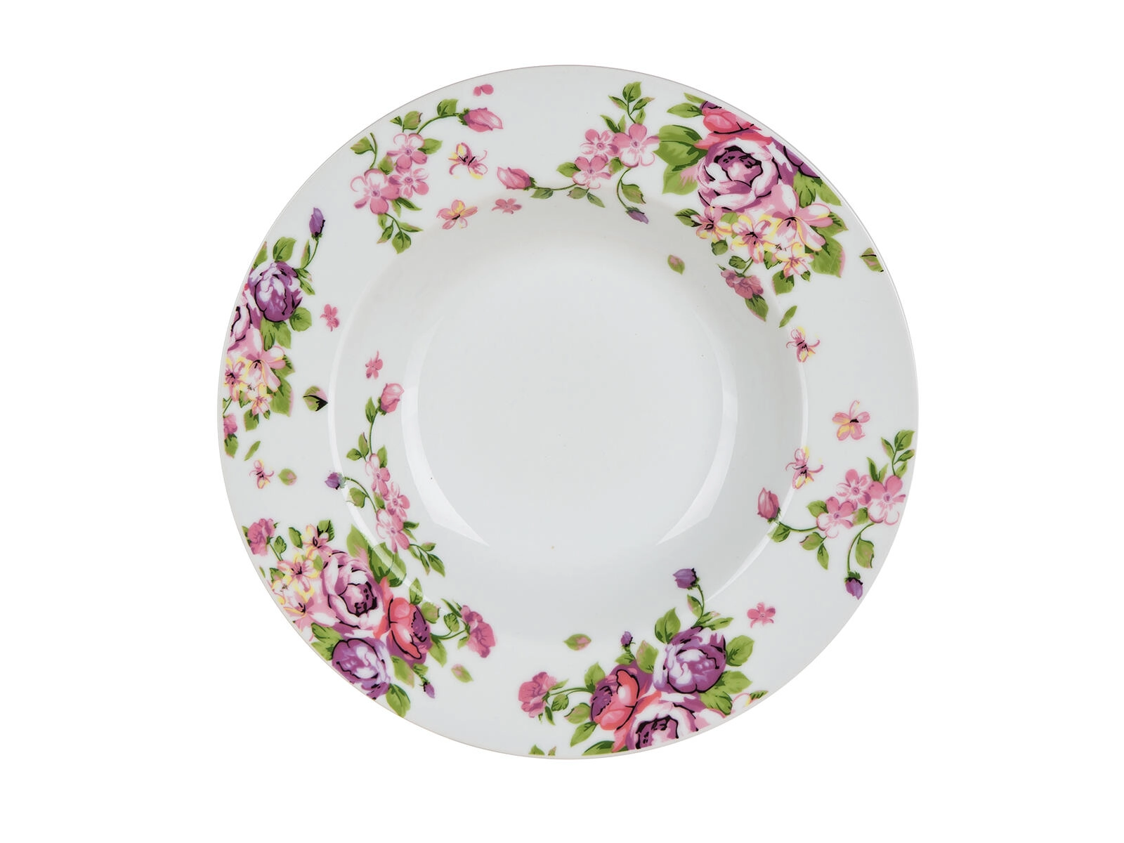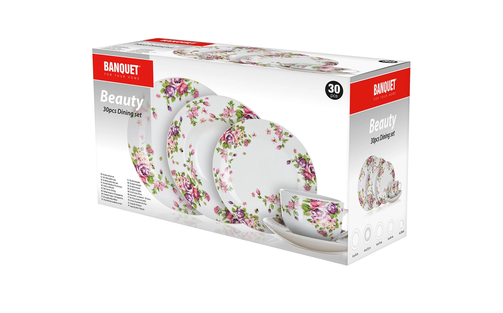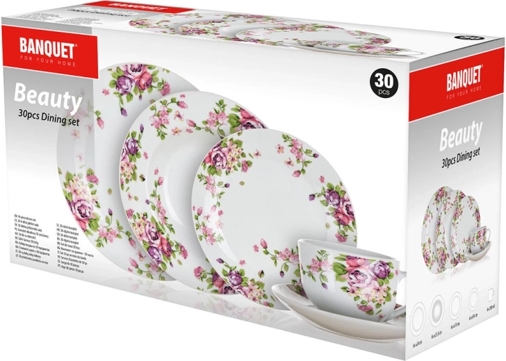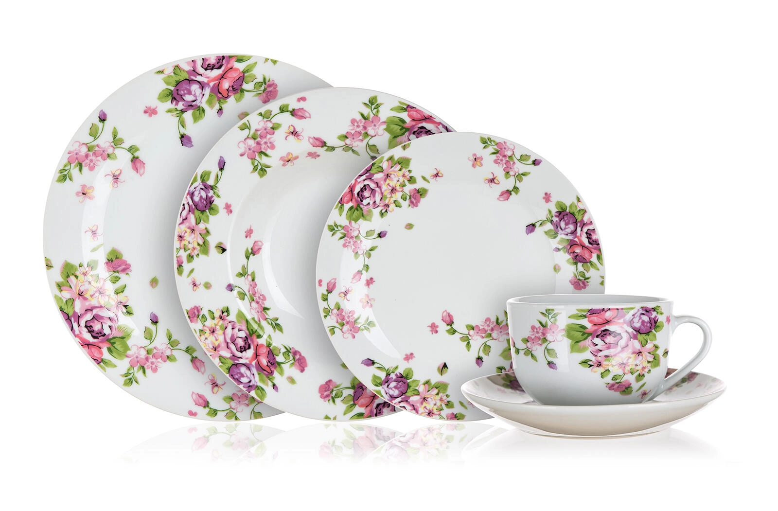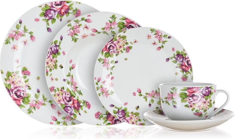 Stylová sada nádobí Beauty kombinuje klasický bílý porcelán s romantickým květinovým motivem, který ladí napříč všemi kusy. Díky promyšlenému složení získáte talíře pro polévky, hlavní chody i dezerty, doplněné o šálky s podšálky pro podávání kávy či čaje.