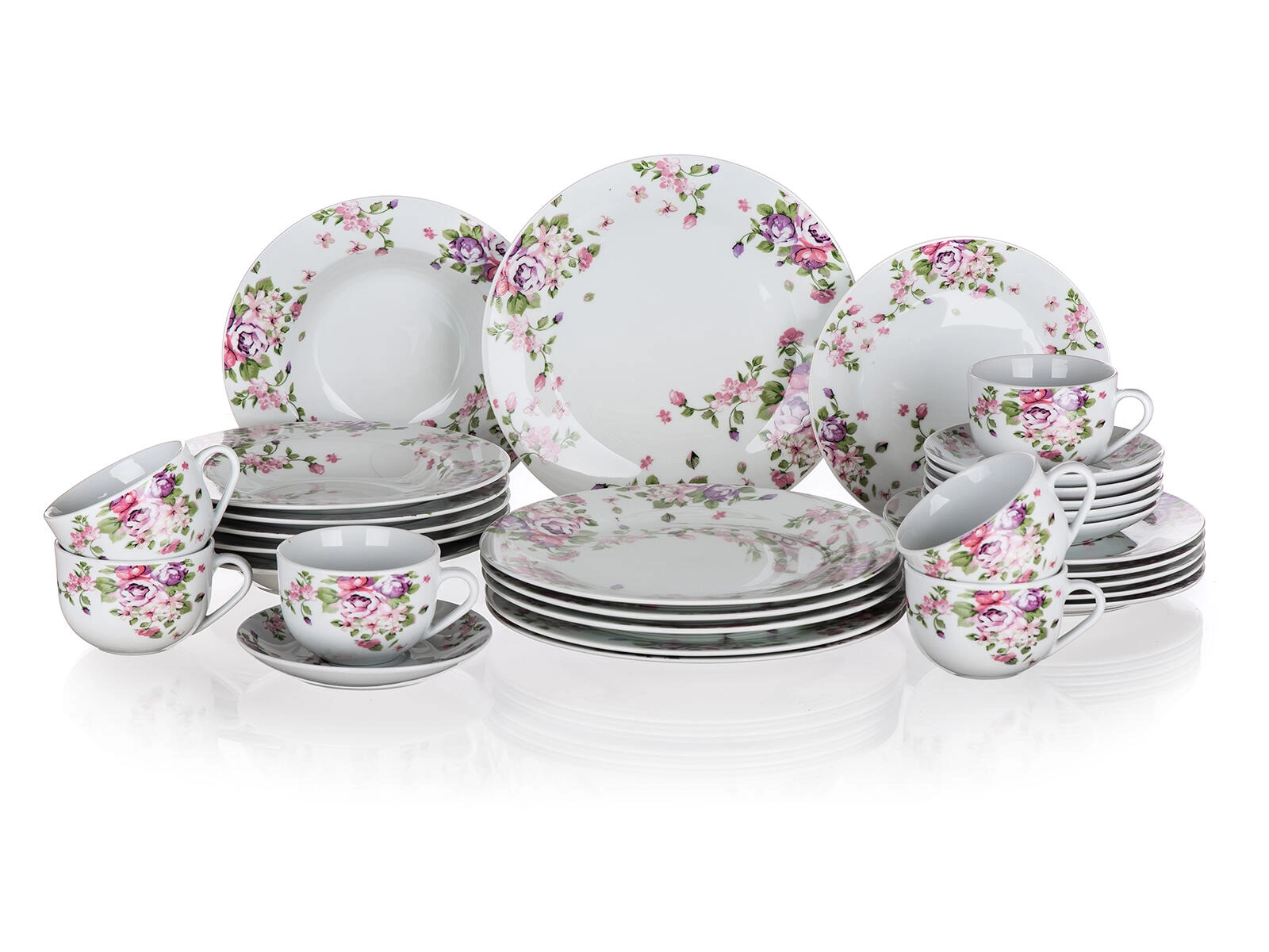Sada obsahuje 30 dílů: 6 hlubokých, 6 mělkých a 6 dezertních talířů, 6 podšálků a 6 šálků o objemu 220 ml – ideální pro každodenní i slavnostní stolování.