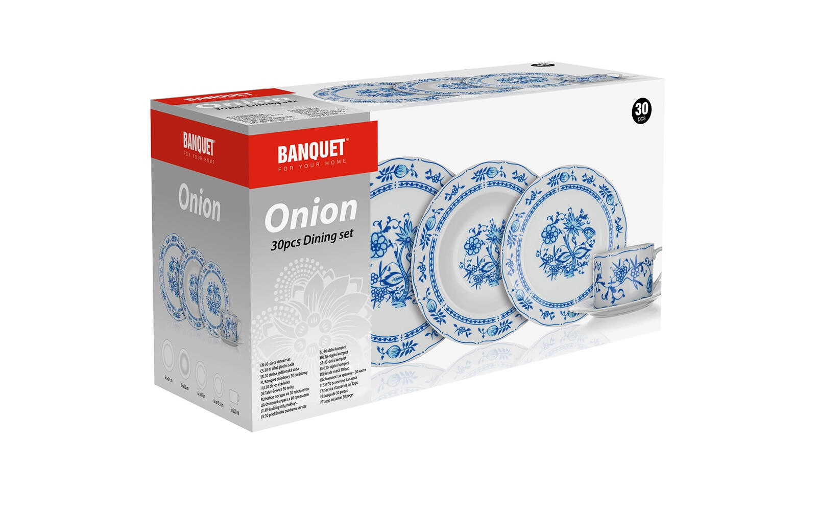 Elegantní 30dílná porcelánová jídelní sada s tradičním cibulákovým dekorem ONION promění každé stolování v jedinečný zážitek. Kvalitní porcelán je vhodný do myčky i mikrovlnné trouby, takže potěší krásným vzhledem i praktickým využitím pro každý den.