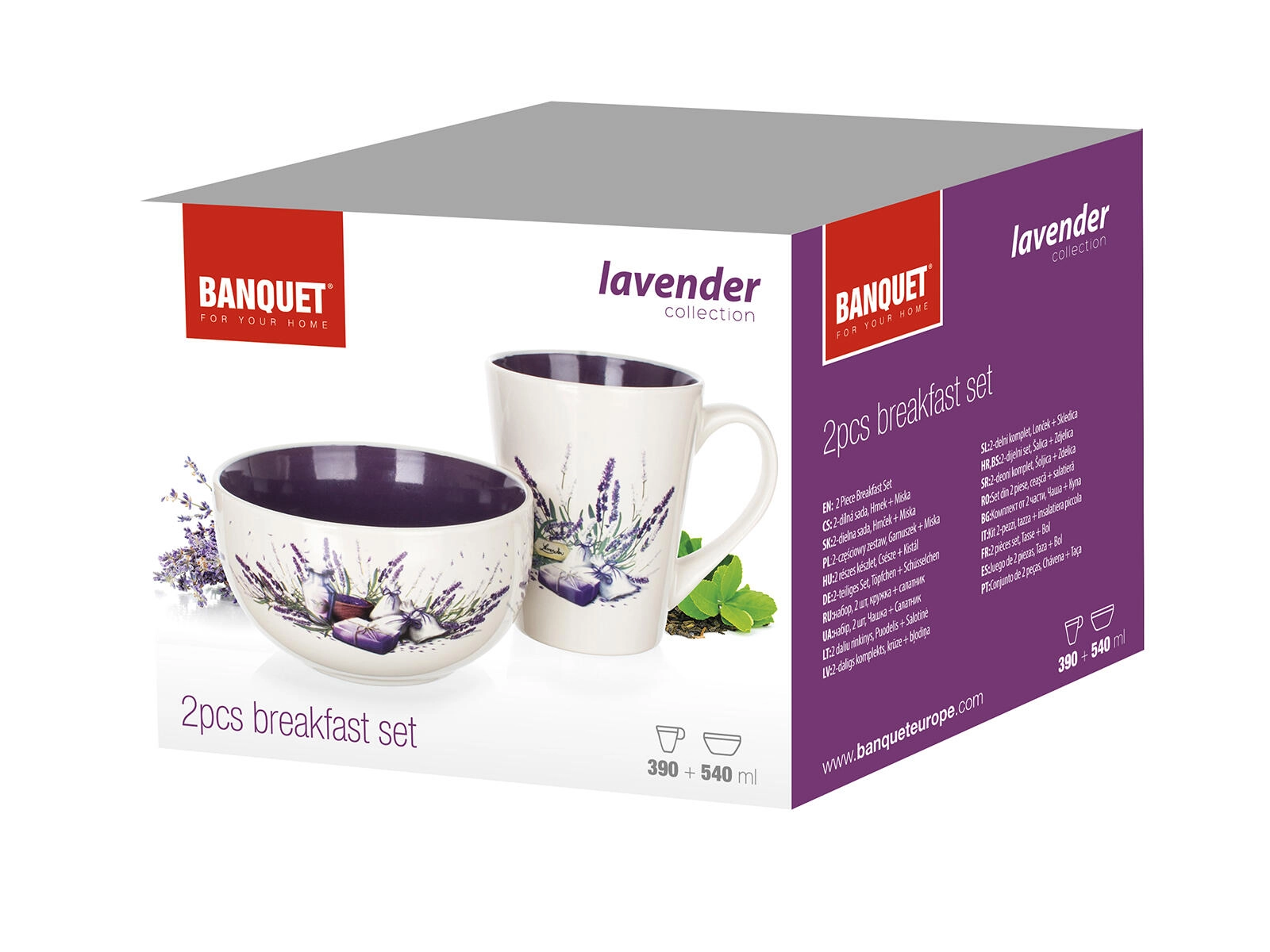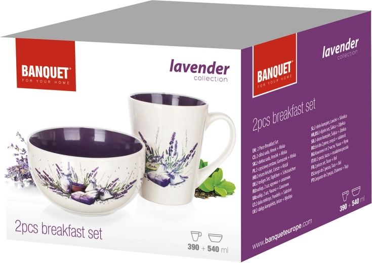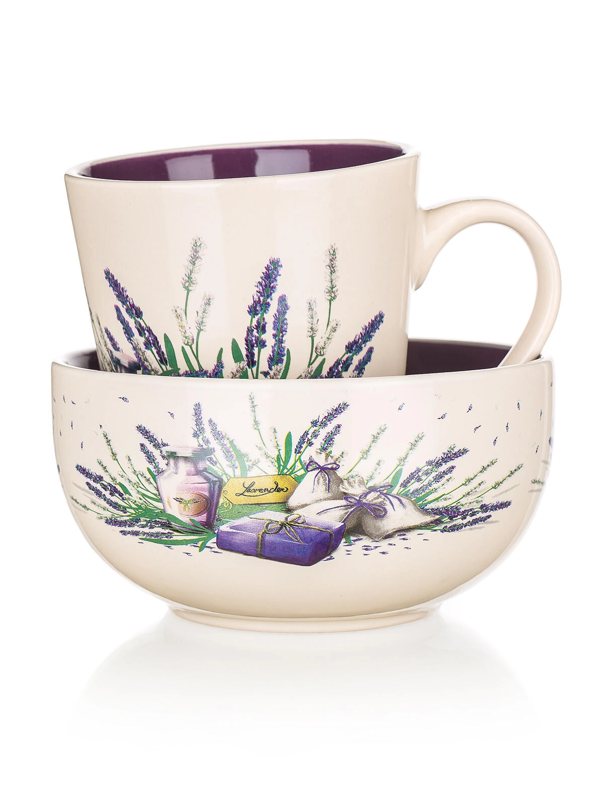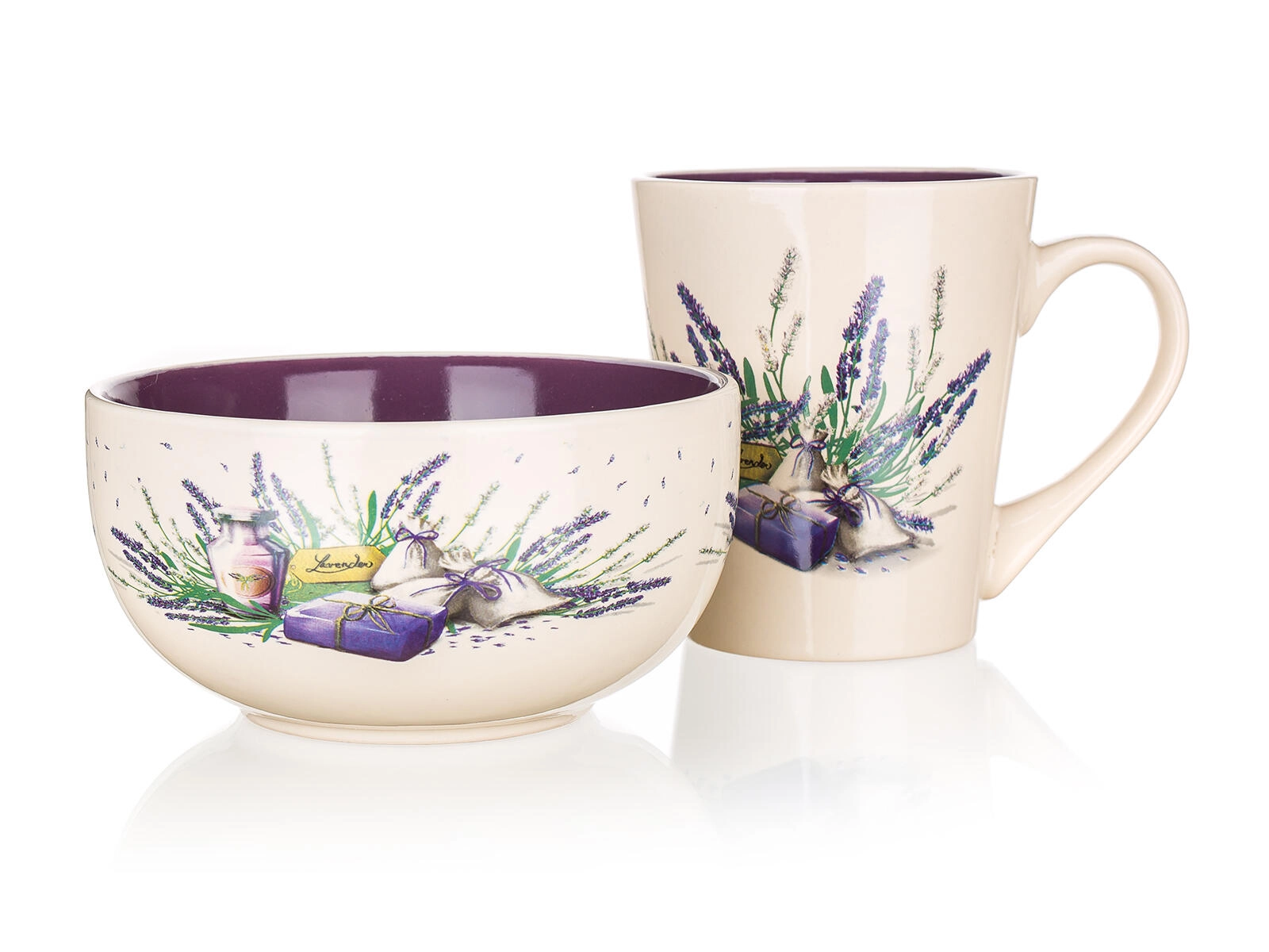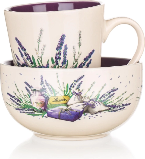 Stylová keramická snídaňová sada s motivem levandule obsahuje hrnek 360 ml a misku 540 ml. Dvoubarevná glazura béžová/fialová, pohodlné ucho hrnku a snadná údržba díky hladkému lesklému povrchu. Ideální na čaj, kávu, müsli i polévky a jako dekorativní doplněk kuchyně.