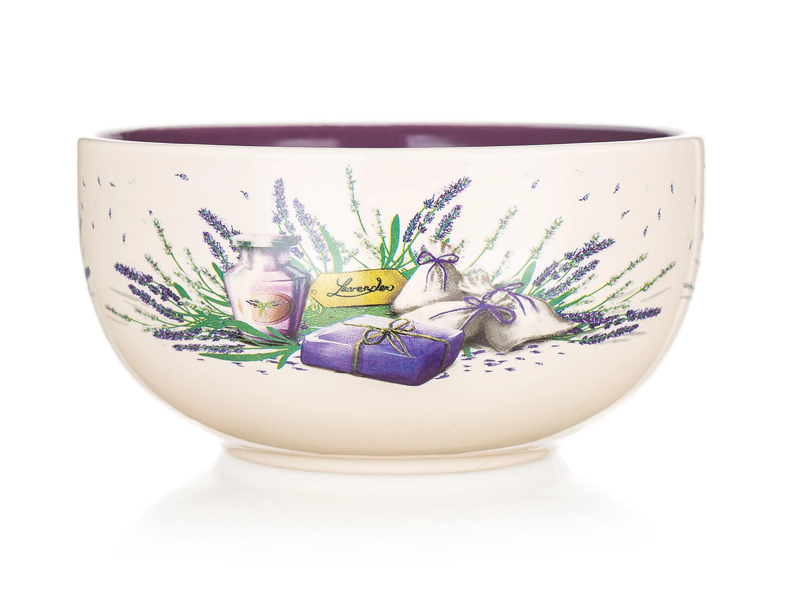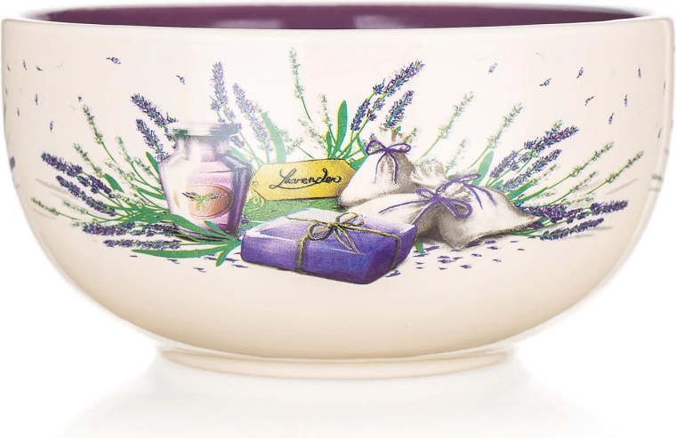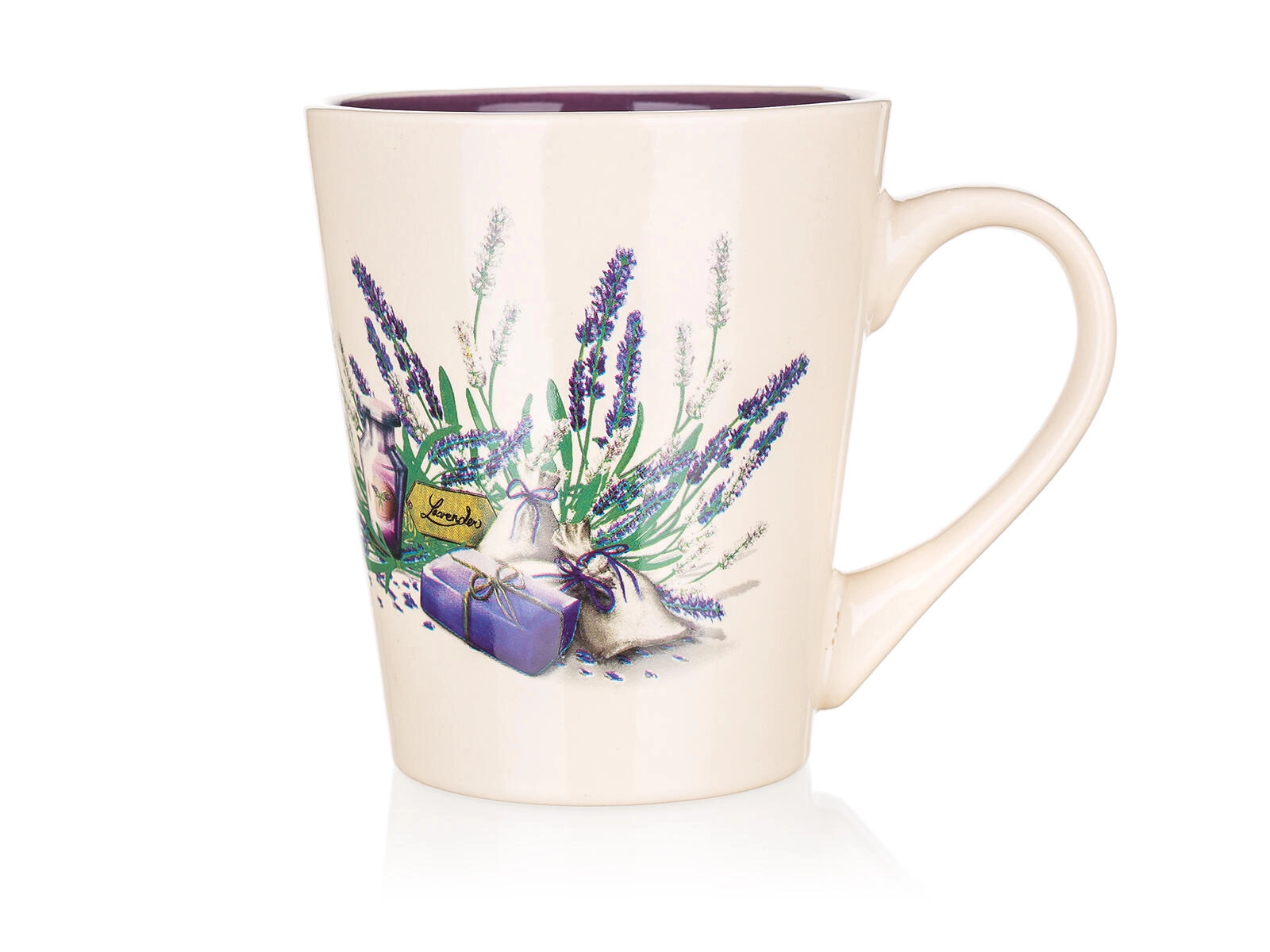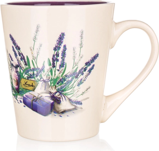 Stylová keramická snídaňová sada s motivem levandule obsahuje hrnek 360 ml a misku 540 ml. Dvoubarevná glazura béžová/fialová, pohodlné ucho hrnku a snadná údržba díky hladkému lesklému povrchu. Ideální na čaj, kávu, müsli i polévky a jako dekorativní doplněk kuchyně.
