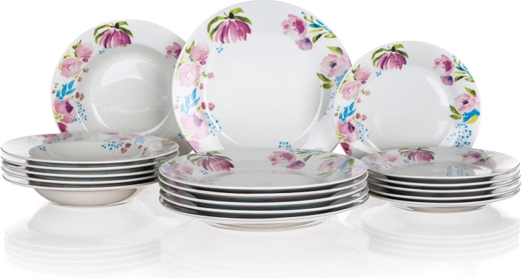 Sada obsahuje 18 kusů: 6× dezertní talíř 19 cm, 6× hluboký talíř 21,5 cm a 6× mělký talíř 24 cm. Vše potřebné pro každodenní i slavnostní stolování.