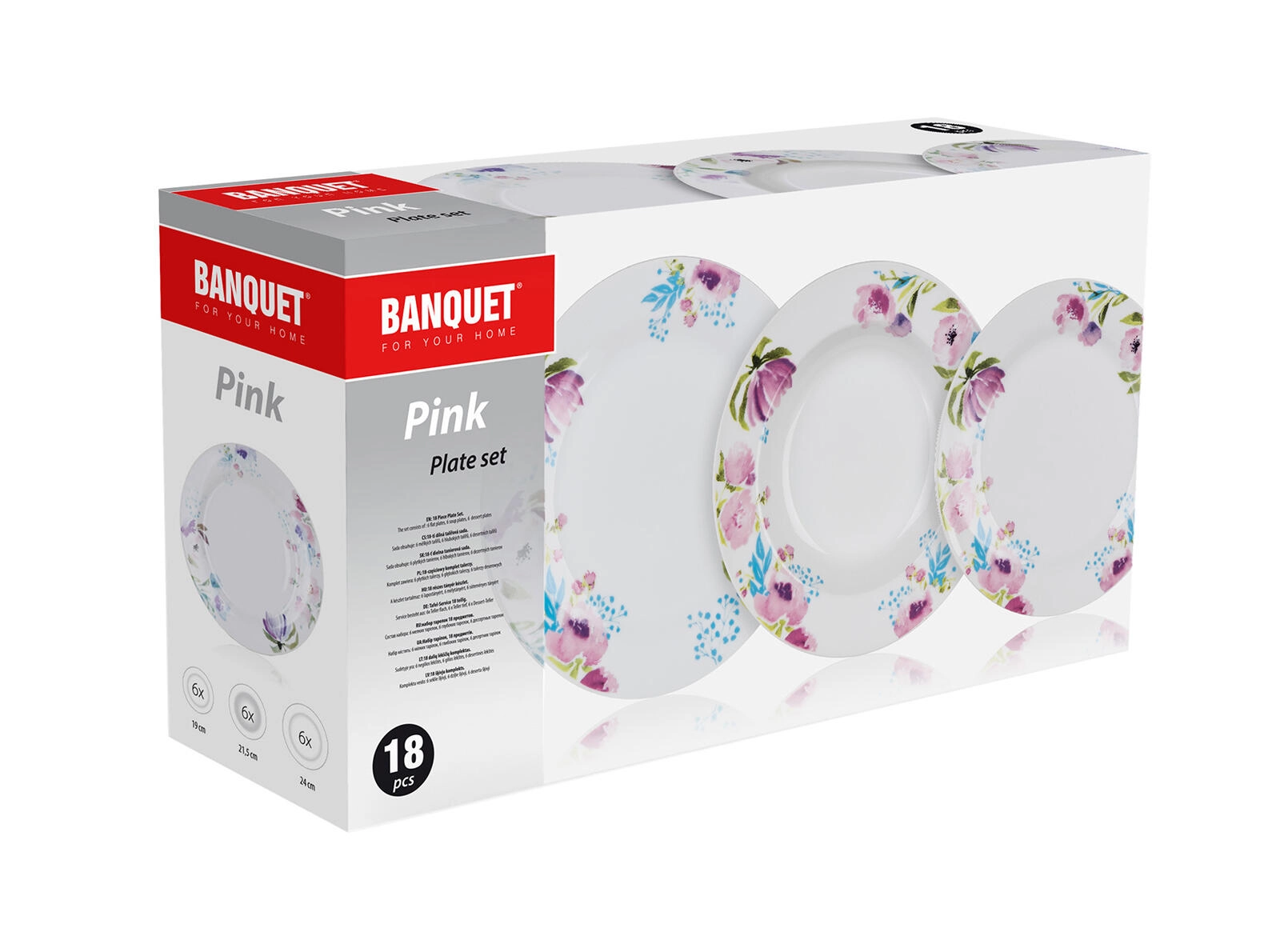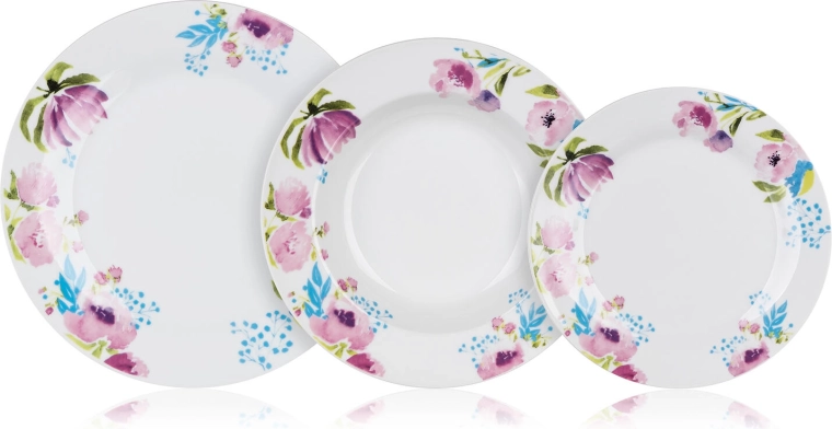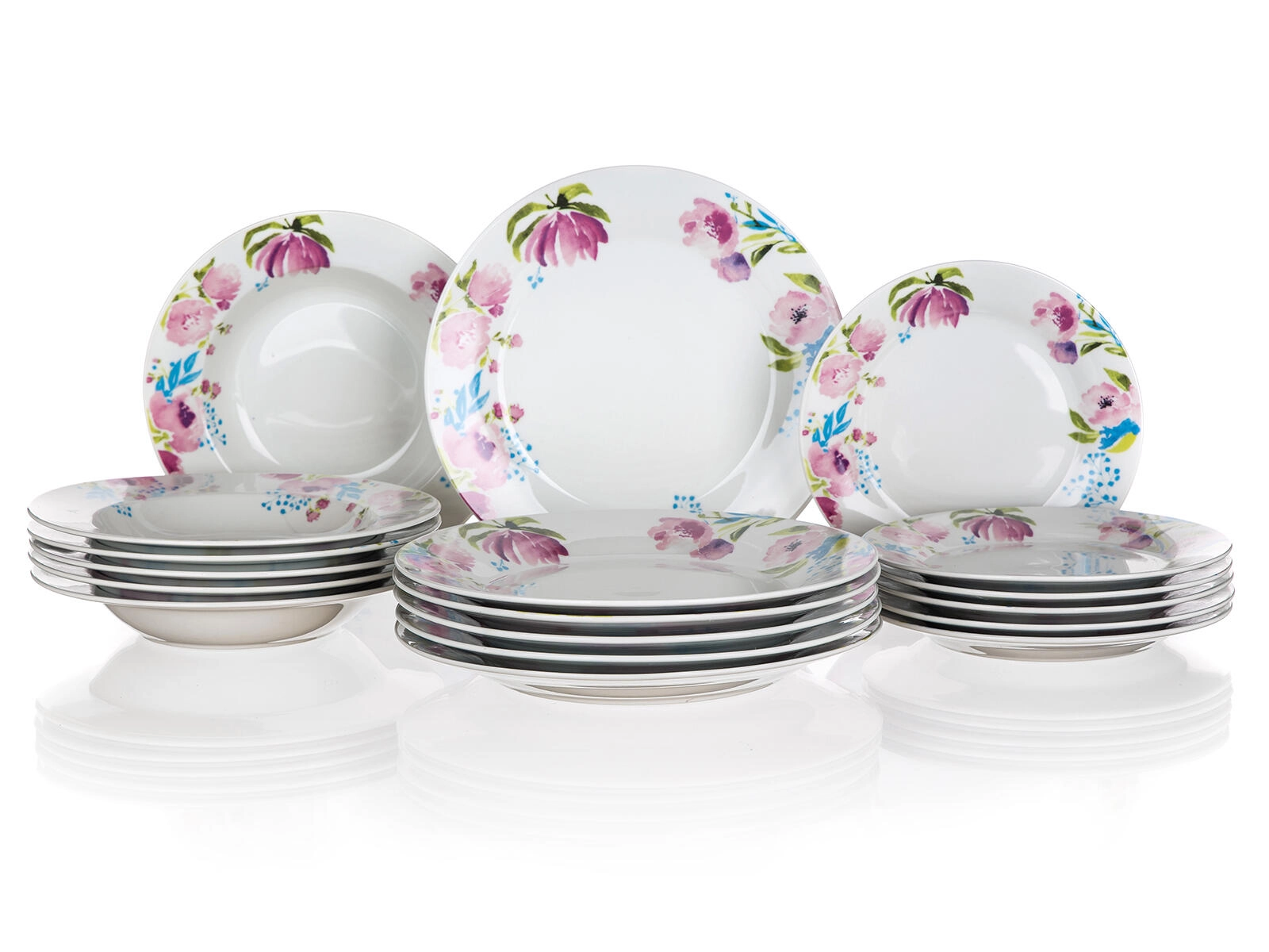 Elegantní 18dílná porcelánová jídelní sada s jemným květinovým dekorem Pink Flowers zkrášlí každý stůl. Obsahuje dezertní, hluboké a mělké talíře pro kompletní servírování. Talíře jsou vhodné do mikrovlnné trouby a lze je mýt v myčce nádobí, takže nabízejí snadnou údržbu a každodenní komfort.