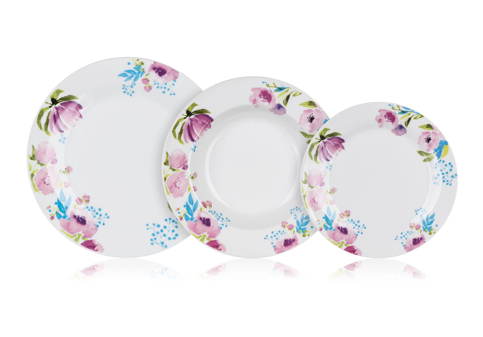 Jemné růžové, fialové a modré květy po obvodu dodávají bílému porcelánu svěží vzhled a snadno se kombinují s dalším nádobím a textiliemi.