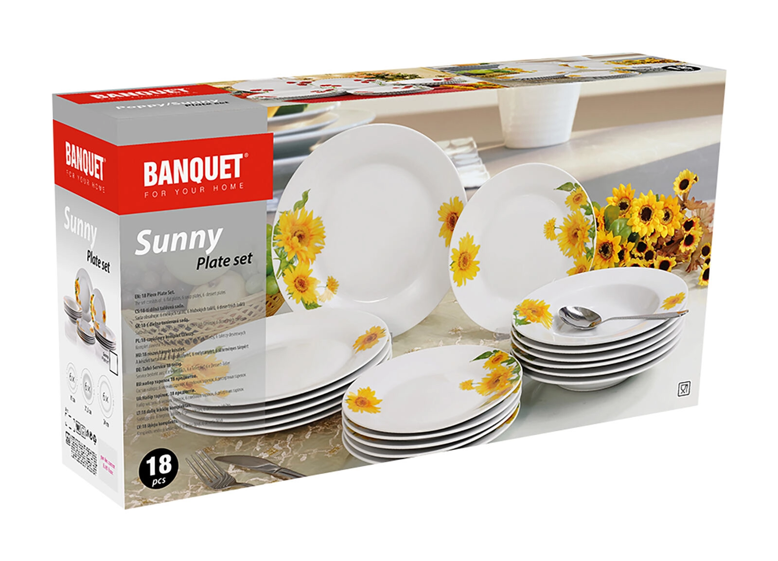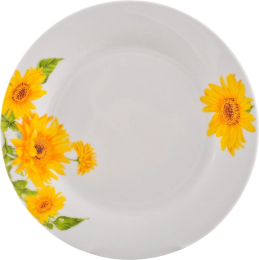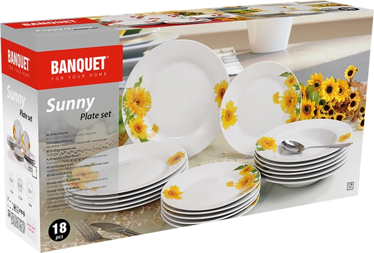 Rozjasněte každý stůl s porcelánovou sadou SUNNY s motivem slunečnic. Elegantní bílý porcelán s lesklým povrchem a výrazným květinovým dekorem je ideální pro každodenní stolování i slavnostní příležitosti. Sada zahrnuje 18 dílů pro 6 osob a je vhodná do myčky nádobí i mikrovlnné trouby.