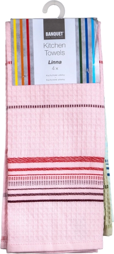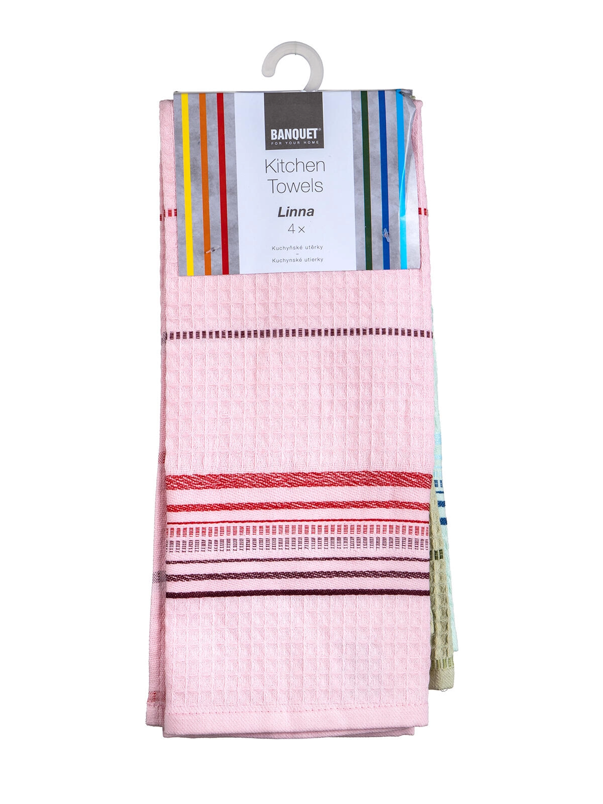 Praktická sada kuchyňských utěrek LINNA z 100% bavlny nabízí výbornou savost a odolnost pro každodenní použití. Vaflová struktura s vícebarevnou vetkávanou bordurou rychle schne, je příjemná na dotek a dodá vaší kuchyni svěží vzhled. Balení obsahuje 4 kusy v mixu barev (bílá, růžová, modrá, zelená) o rozměru 40 × 60 cm.
