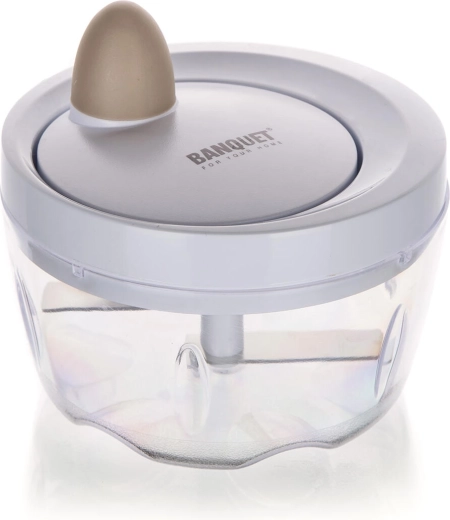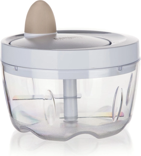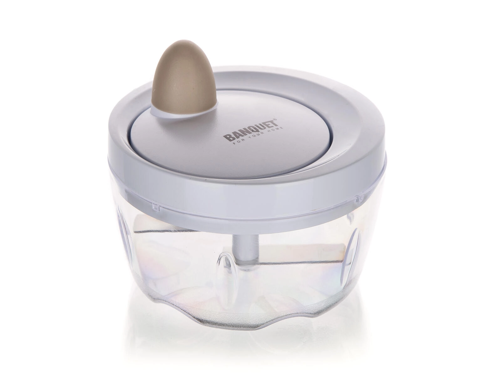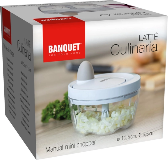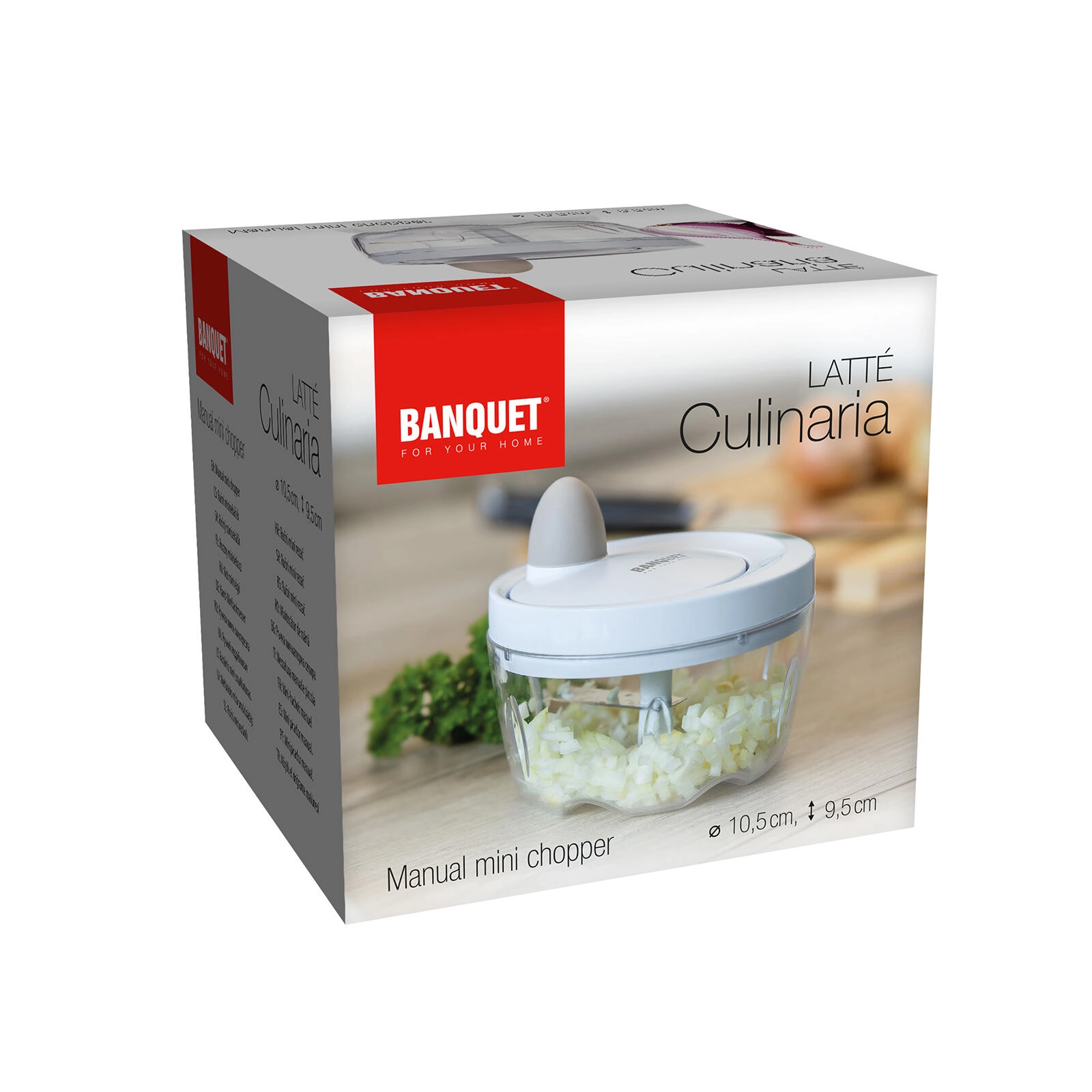Kompaktní ruční minisekáček Culinaria Latte s transparentní miskou a ostrými nerezovými noži rychle naseká ovoce, zeleninu i bylinky na malé kousky. Díly se snadno čistí a díky praktickému víčku s táhlem je sekání rychlé a bez elektřiny.