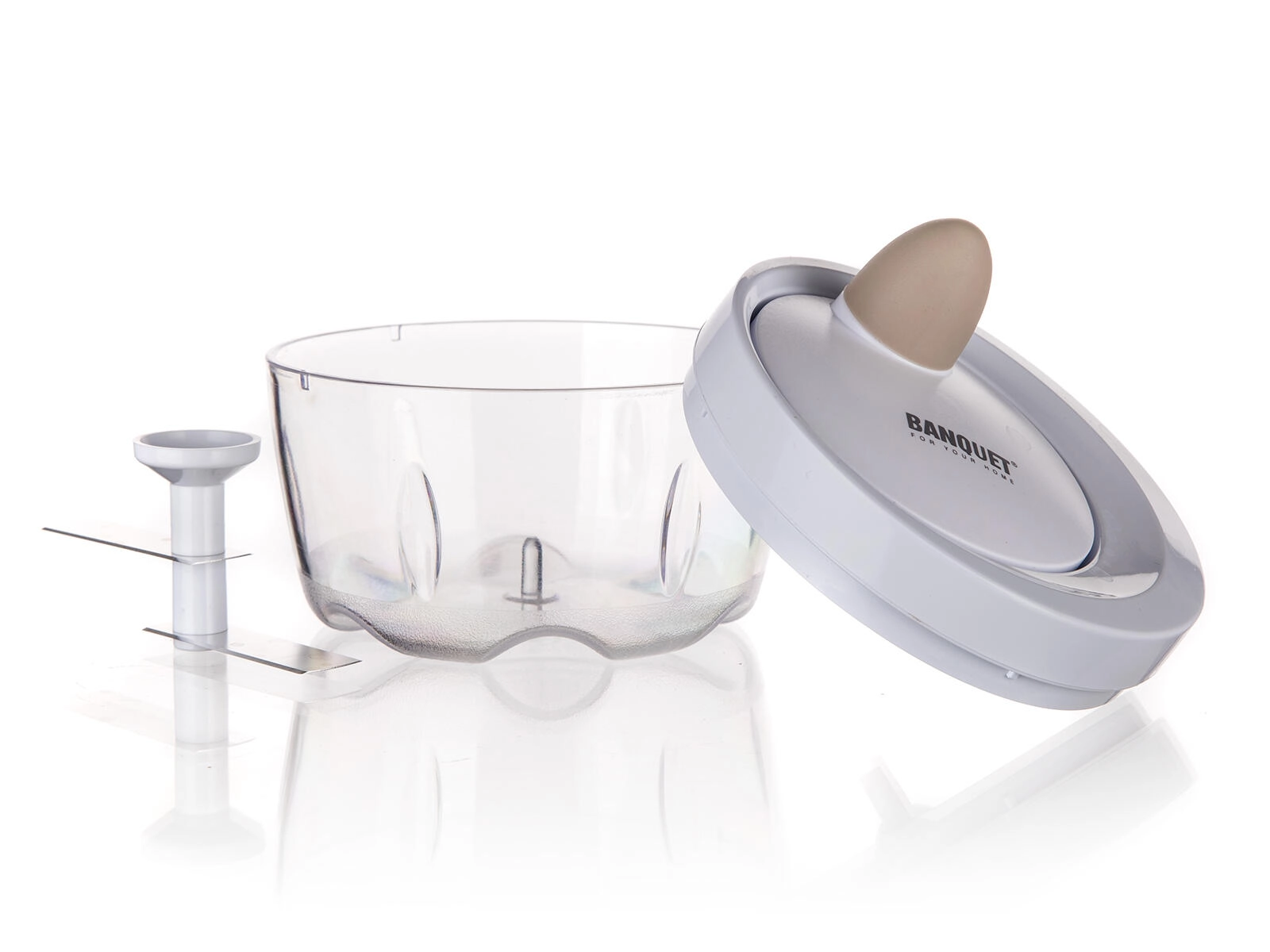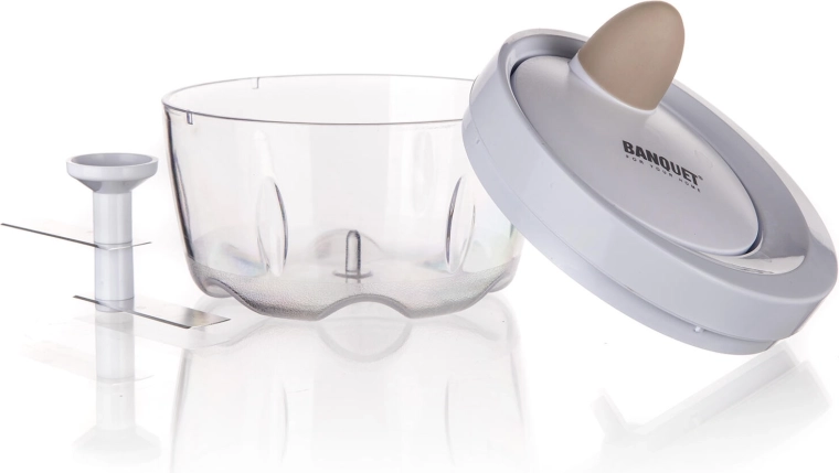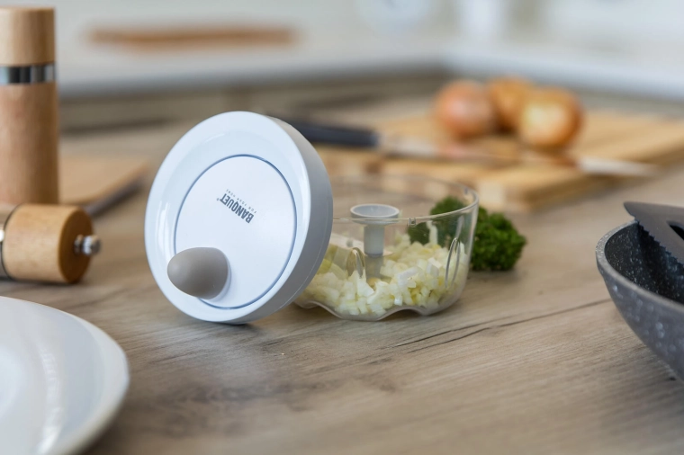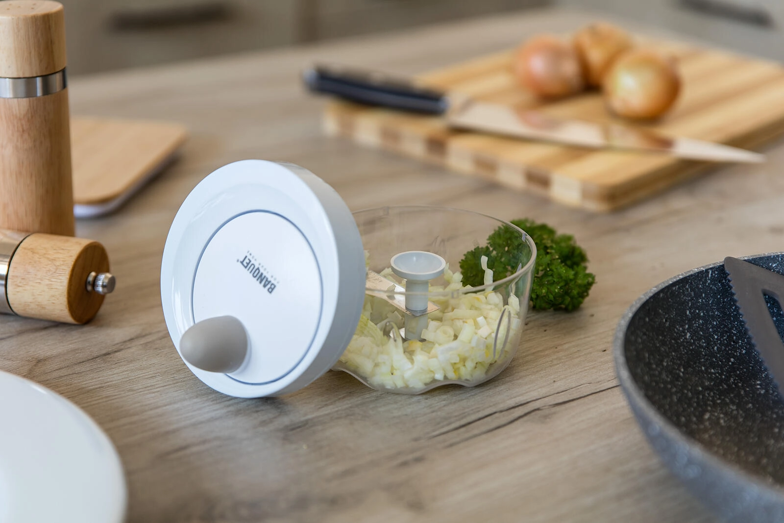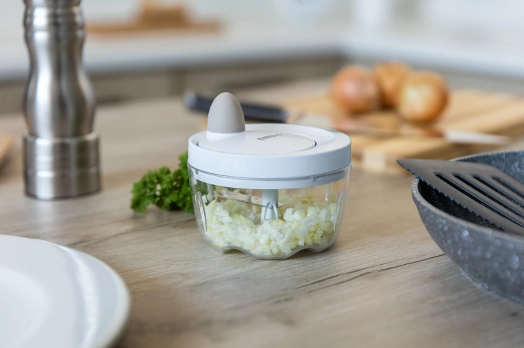 Mechanický pohon s táhlem roztočí nerezové nože během vteřin. Ideální pro cibuli, bylinky i ovoce.