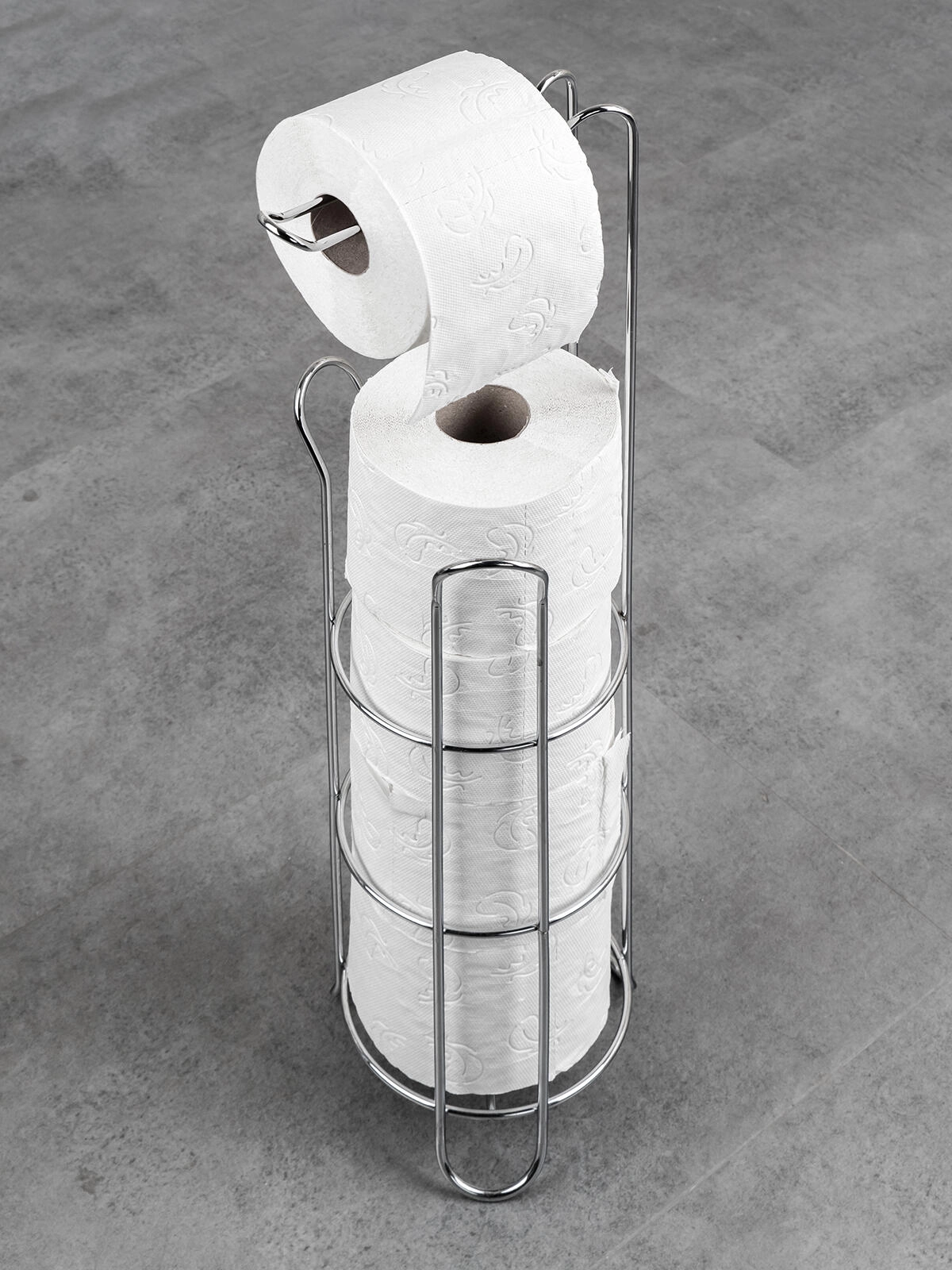 Vertikální drátěná konstrukce pojme 3 náhradní role a další roli pohodlně nasadíte na horní rameno pro okamžité použití.