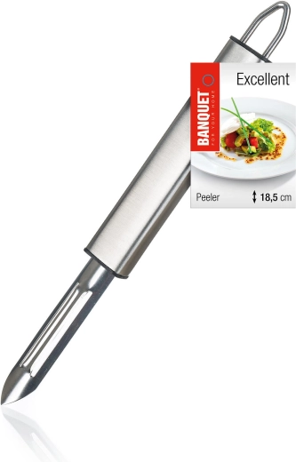 Usnadněte si přípravu jídel se škrabkou EXCELLENT z nerezové oceli. Díky ostrému břitu rychle a pohodlně oloupete brambory, mrkev, jablka i další druhy ovoce a zeleniny. Odolné materiály zajišťují dlouhou životnost a snadnou údržbu.