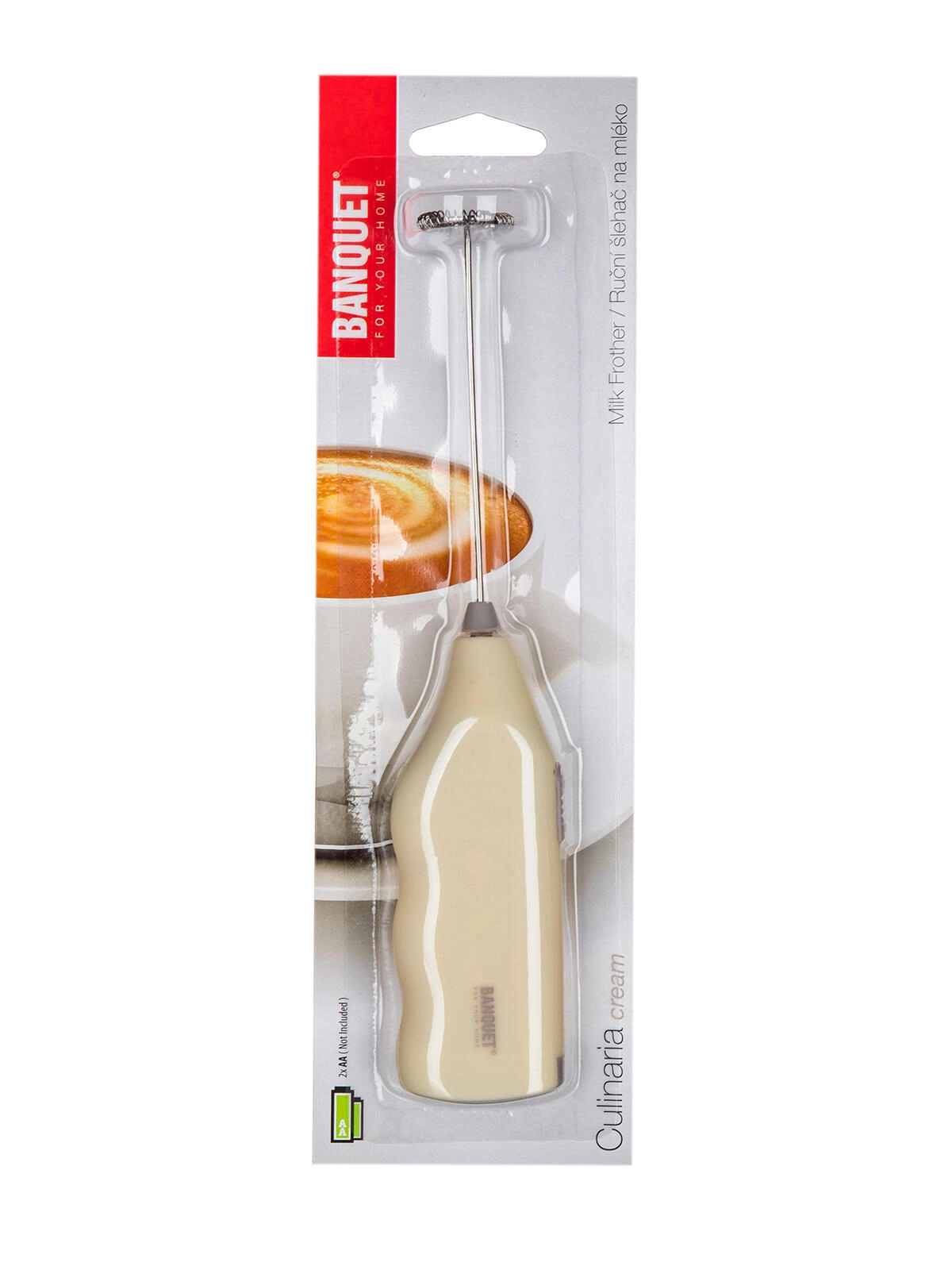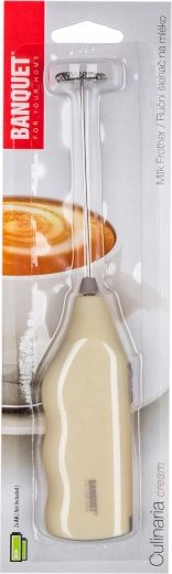 Praktický ruční šlehač na mléčnou pěnu Culinaria v krémové barvě rychle vytvoří jemnou pěnu pro cappuccino, latte i horkou čokoládu. Má ergonomickou rukojeť z odolného ABS, nerezovou šlehací spirálu 18/8 a kompaktní velikost pro snadné použití i skladování. Napájení 2× AA (nejsou součástí balení).