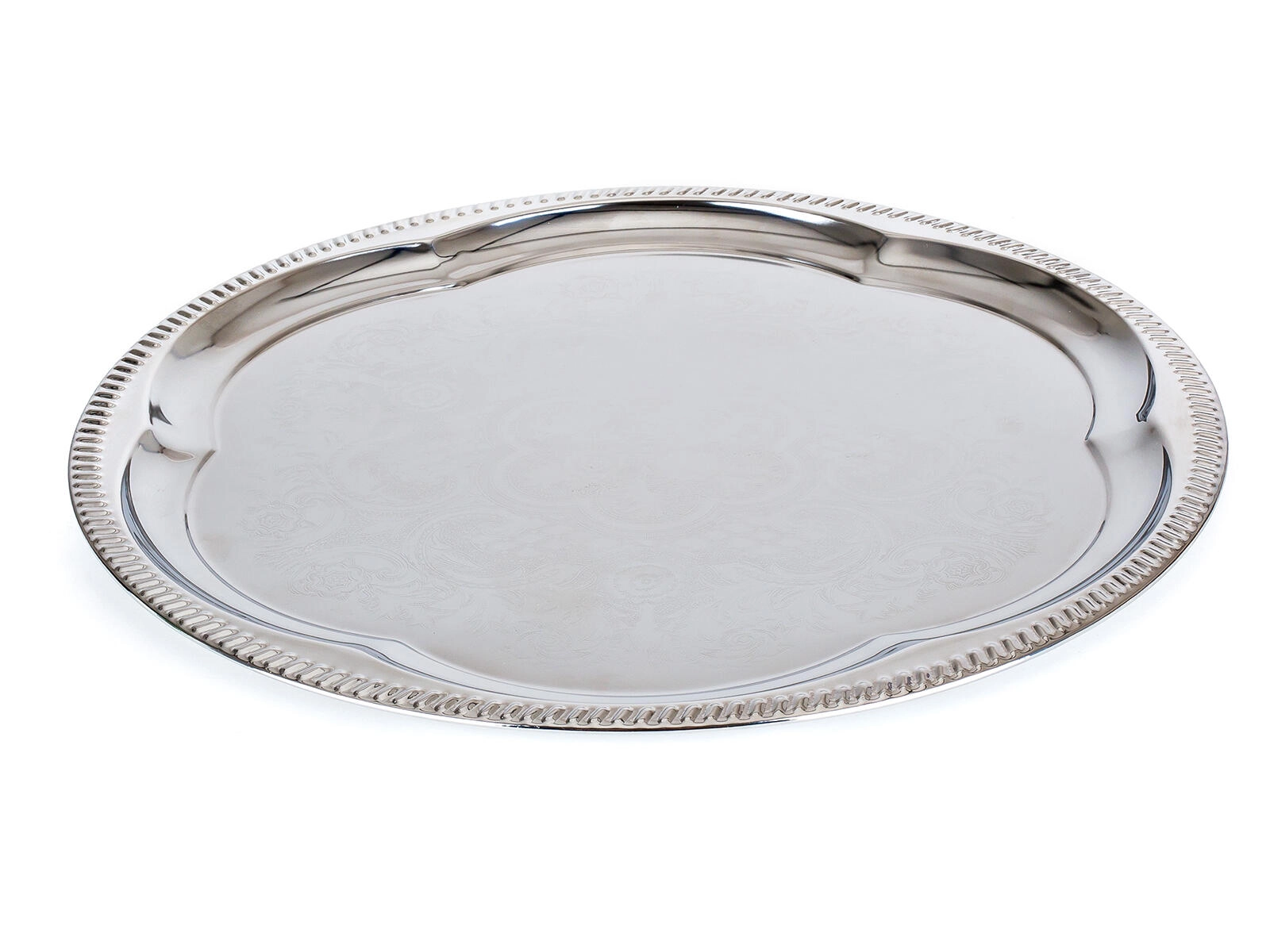 Elegantní servírovací tác AKCENT o průměru 35 cm z pochromovaného kovu je ideální pro stylové podávání nápojů a dezertů. Odolný materiál se snadno čistí, nabízí dlouhou životnost a díky ozdobnému gravírování působí reprezentativně při každé příležitosti.